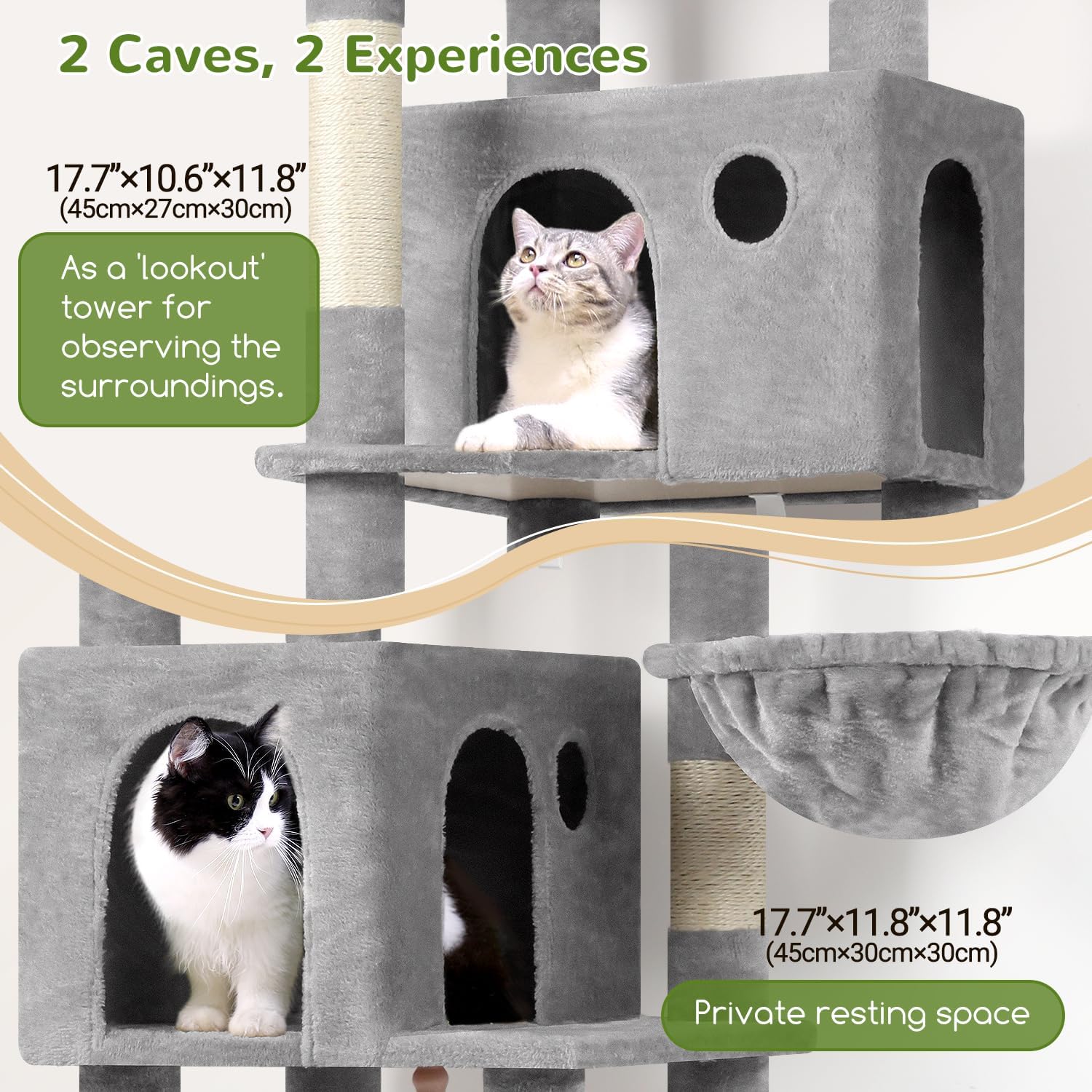 • MULTIPLE RESTING PLACES: Our tall cat tree features a enlarge platform (11.8” x 17.7”), a high point top perch and two spacious cozy cat caves, making it an excellent choice for multi-cat households. Provide ample space and multiple activity areas, allowing each cat to find its own cozy corner and enjoy the fun of playing together