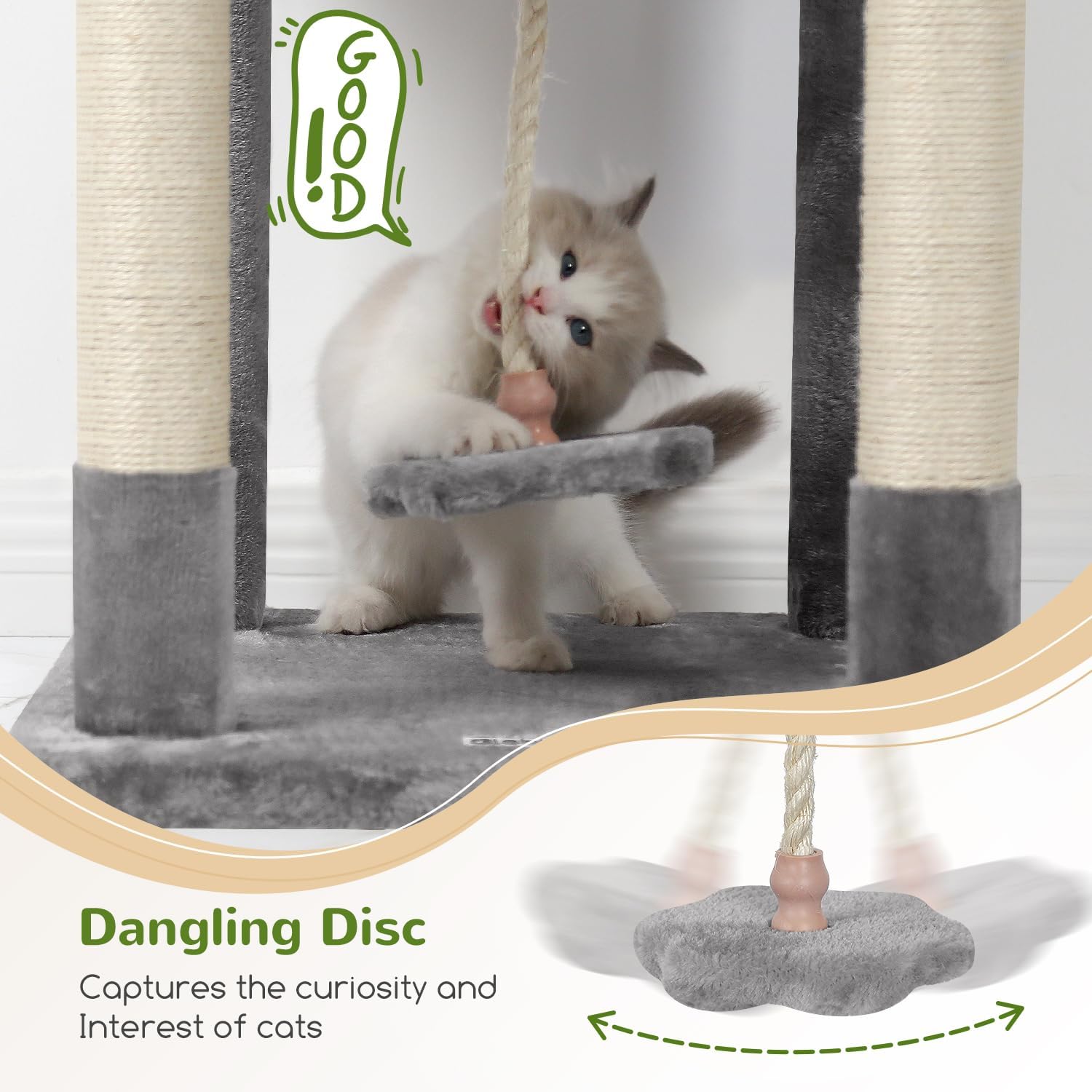 • CREATIVE SISAL ROPE: The pink cat tower addition of the small flower disc enhances the dangling effect of the sisal rope on this cat condo for indoor cats. Additionally, when lightly swayed or touched by the cat, the rope starts to create a dynamic effect similar to that of a pendulum. This dynamic and visually stimulating feature captures the curiosity and interest of cats, increasing playfulness and interaction