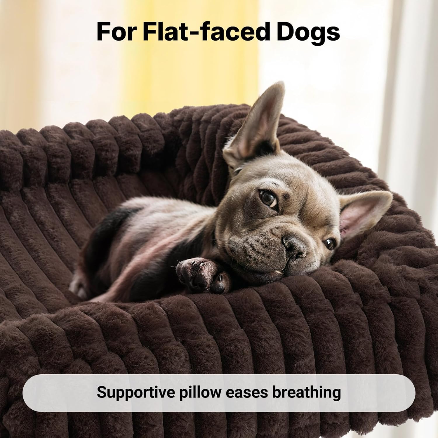 • Secure & Comfortable: The three-sided bolster provides all-around security, while the pillow offers neck support and promotes better breathing, especially for flat-faced breeds. The fluffy plush surface offers calming relaxation