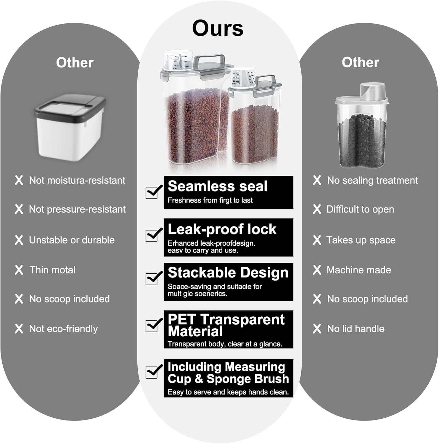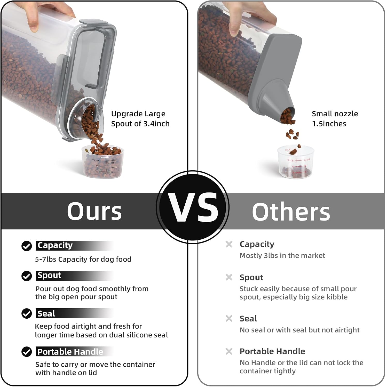 • BENEFITS: Upgraded Large Pour Spout with Measuring Cup-We upgraded the mold so that the pour spout is large enough to pour out large dog food.You can now pour food easily and quickly.The newly upgraded measuring cup can now also be easily screwed onto the nozzle