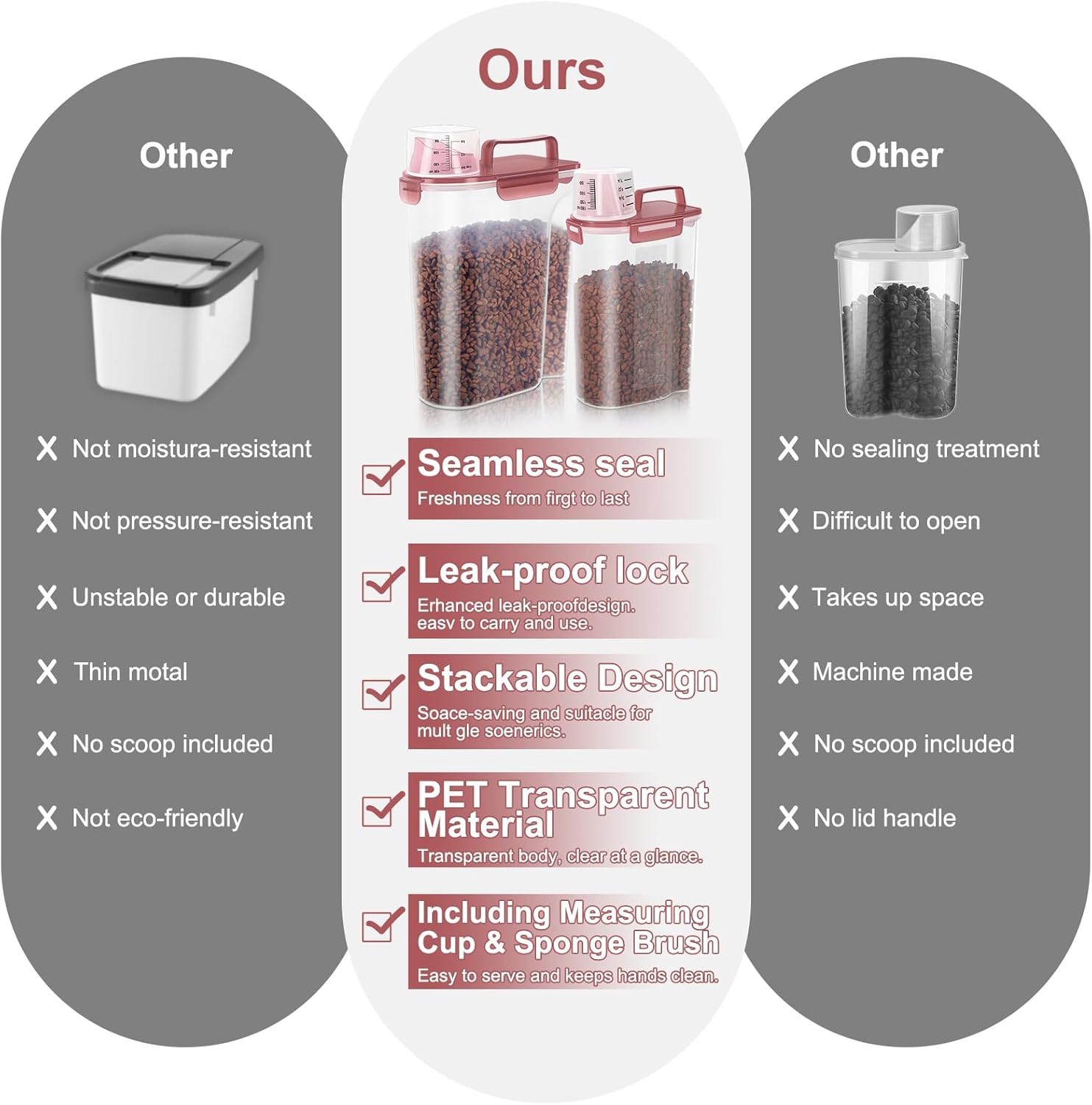 • BENEFITS : Upgraded Large Pour Spout with Measuring Cup-We upgraded the mold so that the pour spout is large enough to pour out large dog food.You can now pour food easily and quickly.The newly upgraded measuring cup can now also be easily screwed onto the nozzle