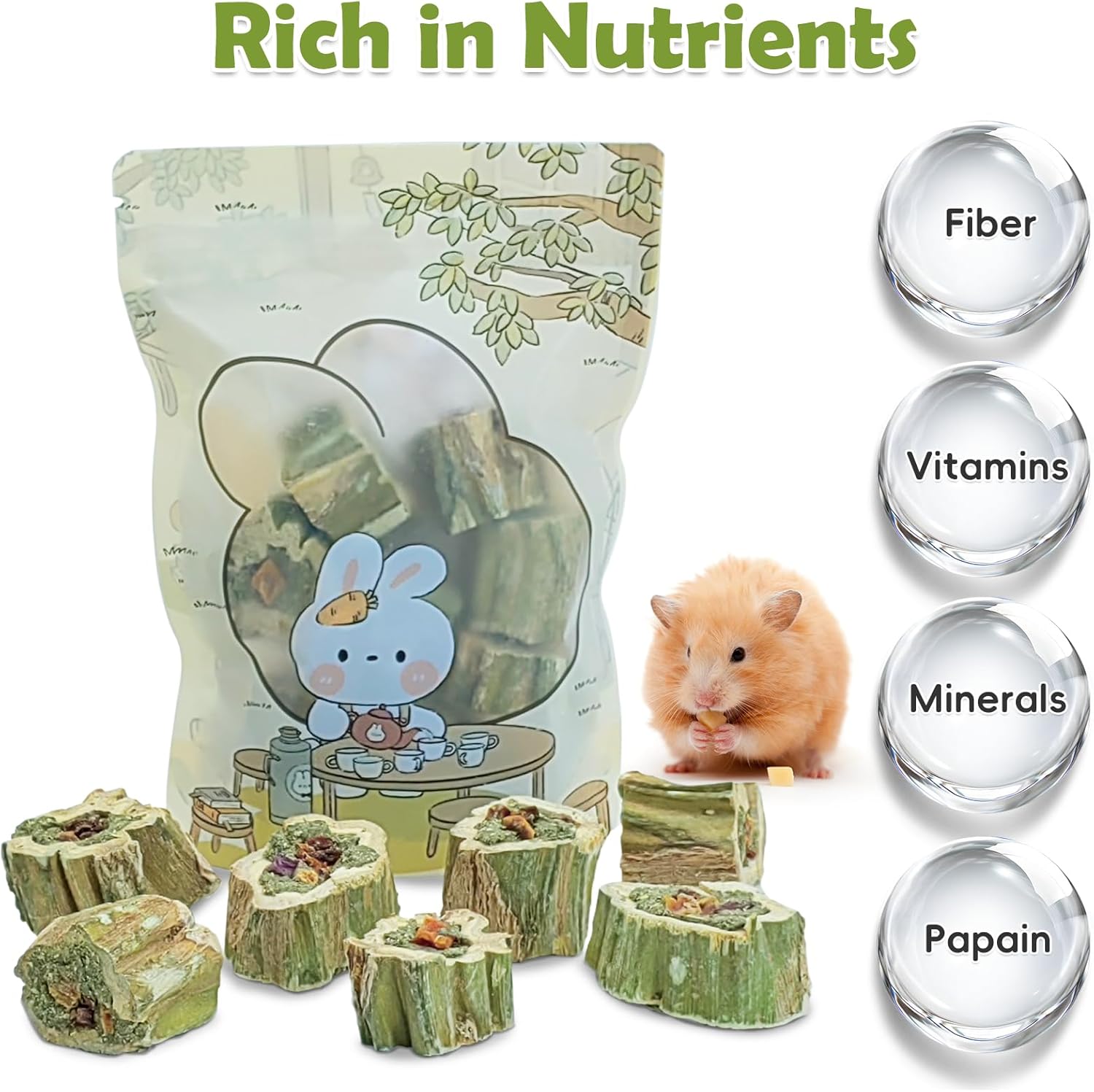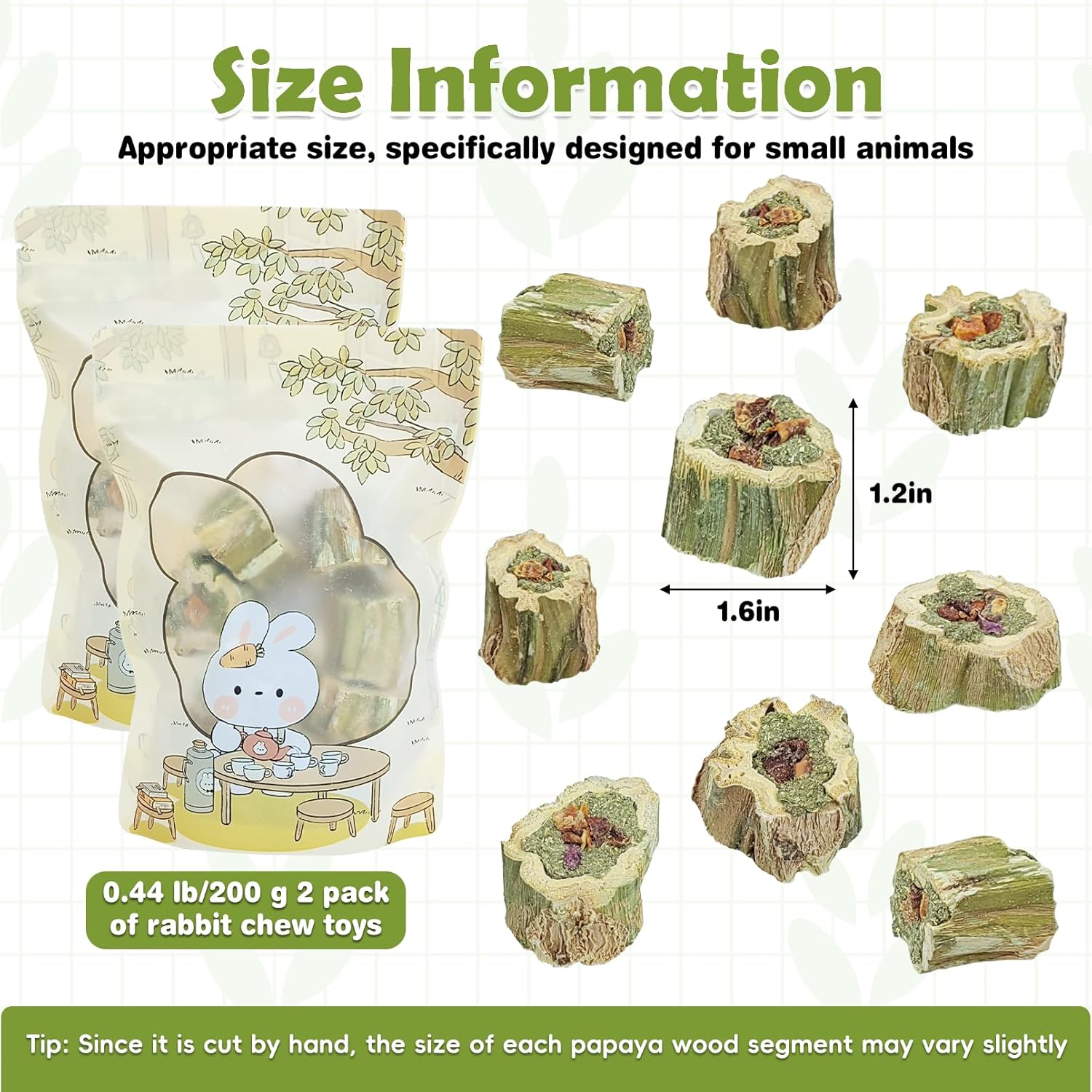 • Nutrient-Rich: The main components of papaya wood include cellulose, hemicellulose, and lignin. Fruits and vegetables are rich in cellulose, vitamins, and minerals, which help maintain your pet's digestive health and provide comprehensive nutrition
