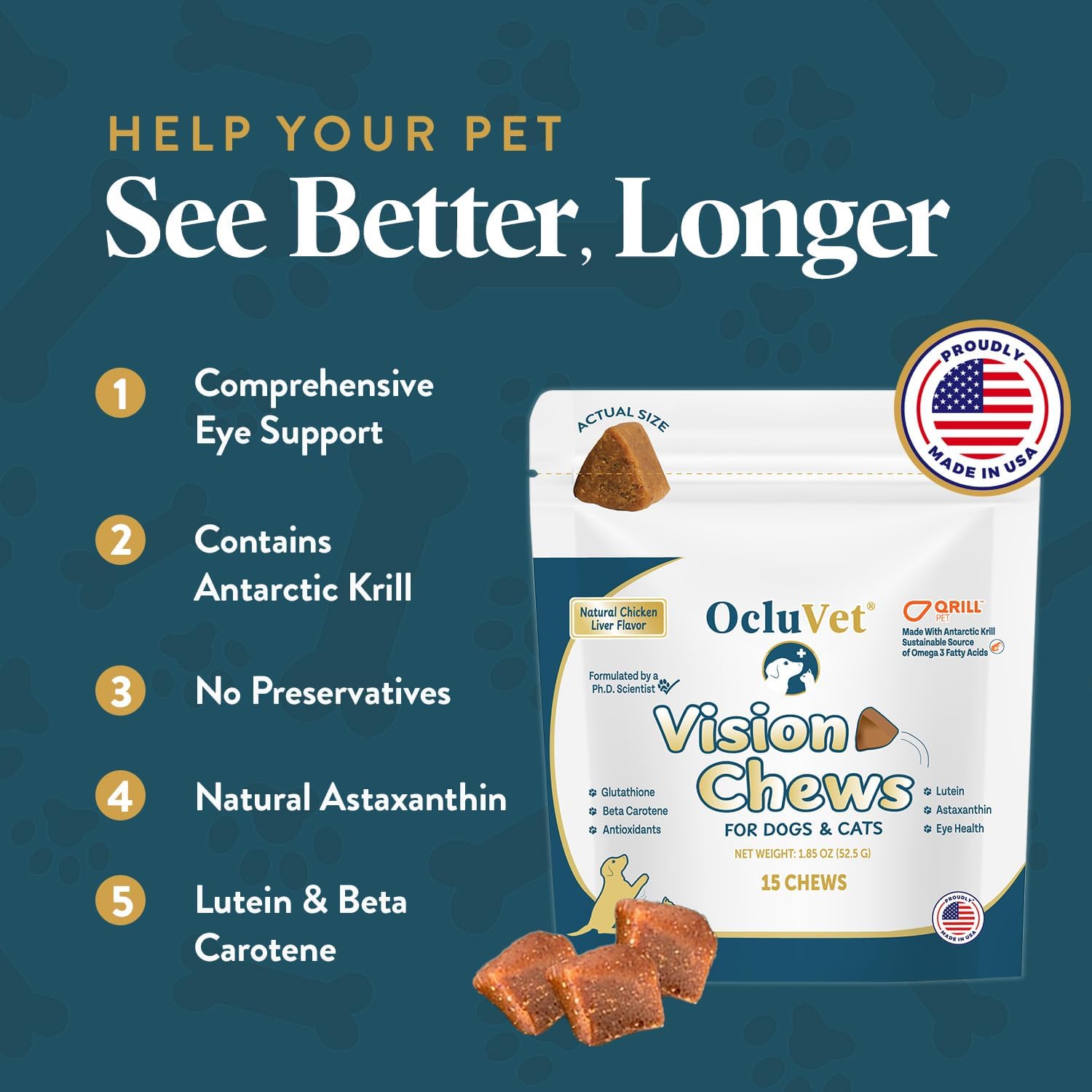 Vision Chews Eye Supplements for Dogs & Cats, Natural Chicken Flavor, Contains Omega 3, Lutein, Antioxidants, & More, Cat & Dog Eye Supplements, No Preservatives, Made in USA, 1 Bag, 15 Chews