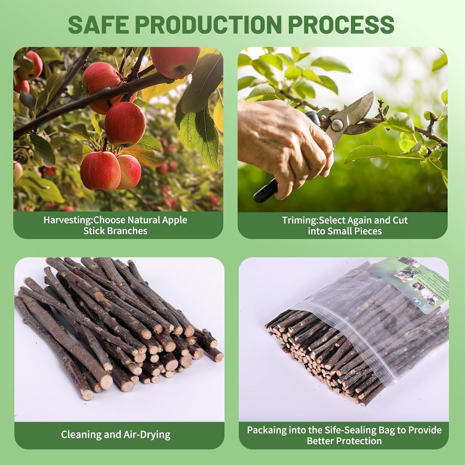 • Natural and Safe: Apple sticks made from FSC-Certified wood, selected raw materials and refuse to add. On the premise of retaining the original fragrance of apple branches, it is dust-free, pollution-free, high dryness, and easy to store, which guarantee your pet babies safely chew.