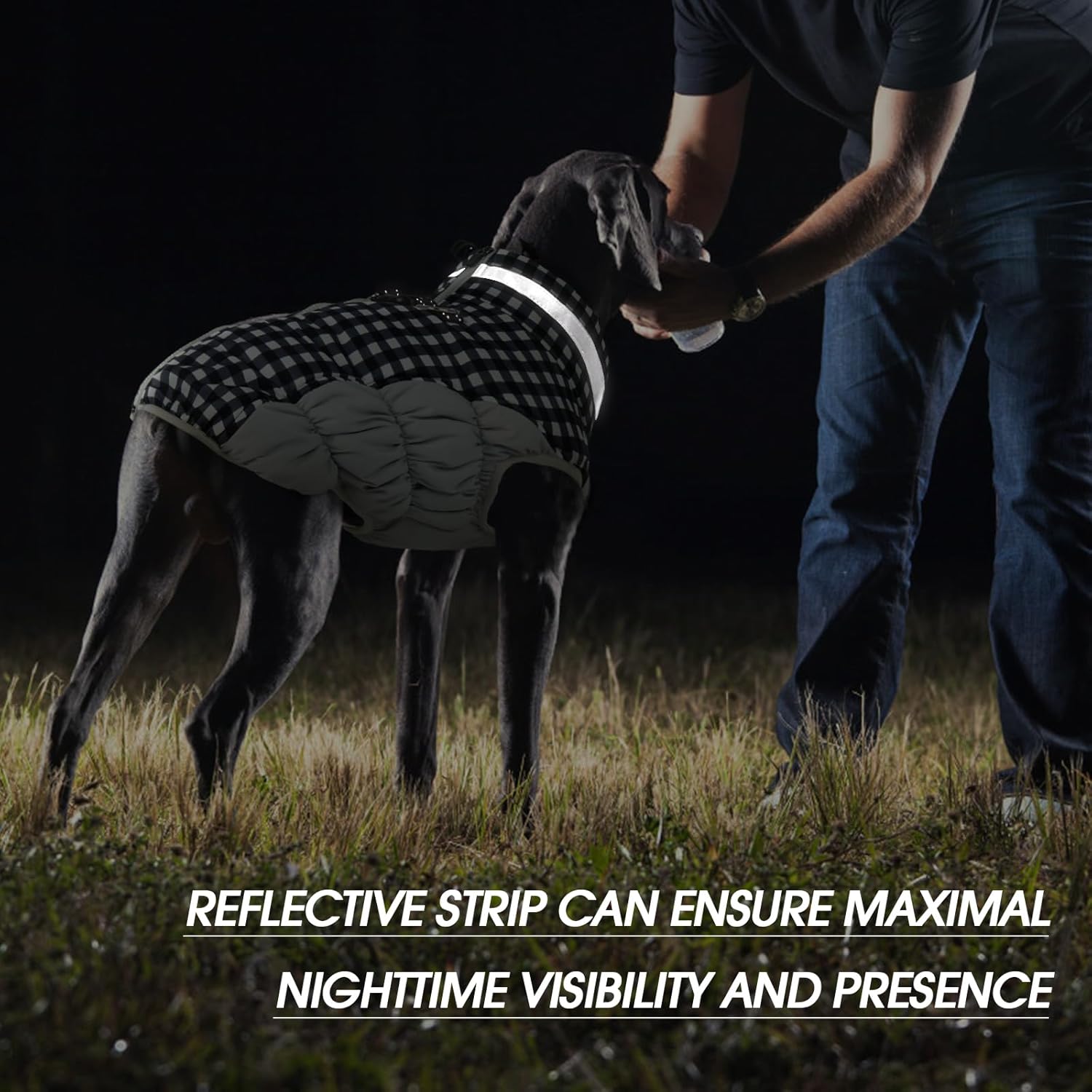 FUAMEY Dog Coat for Large Dogs,Waterproof Dog Winter Jacket with Harness Built in Puppy Cold Weather Coats Reflective Pet Vest with Zipper Warm Fleece Dogs Snowsuit Windproof Checkerboard XL