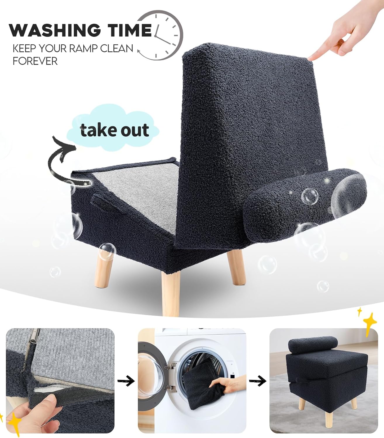 • Stylish, Pet-Friendly Construction:Features a cozy sherpa surface and sturdy wood legs that blend with your home décor. The soft, non-slip ramp surface provides secure footing for pets of all sizes and breeds.