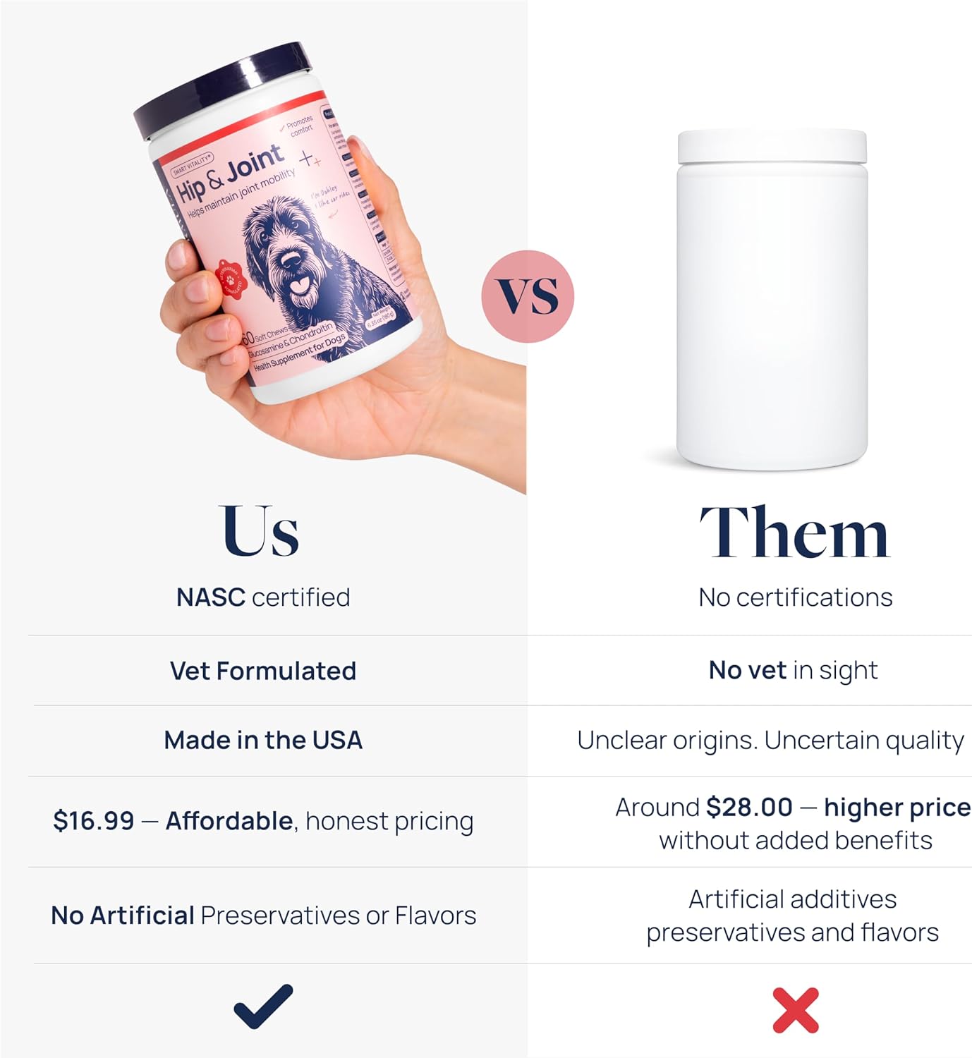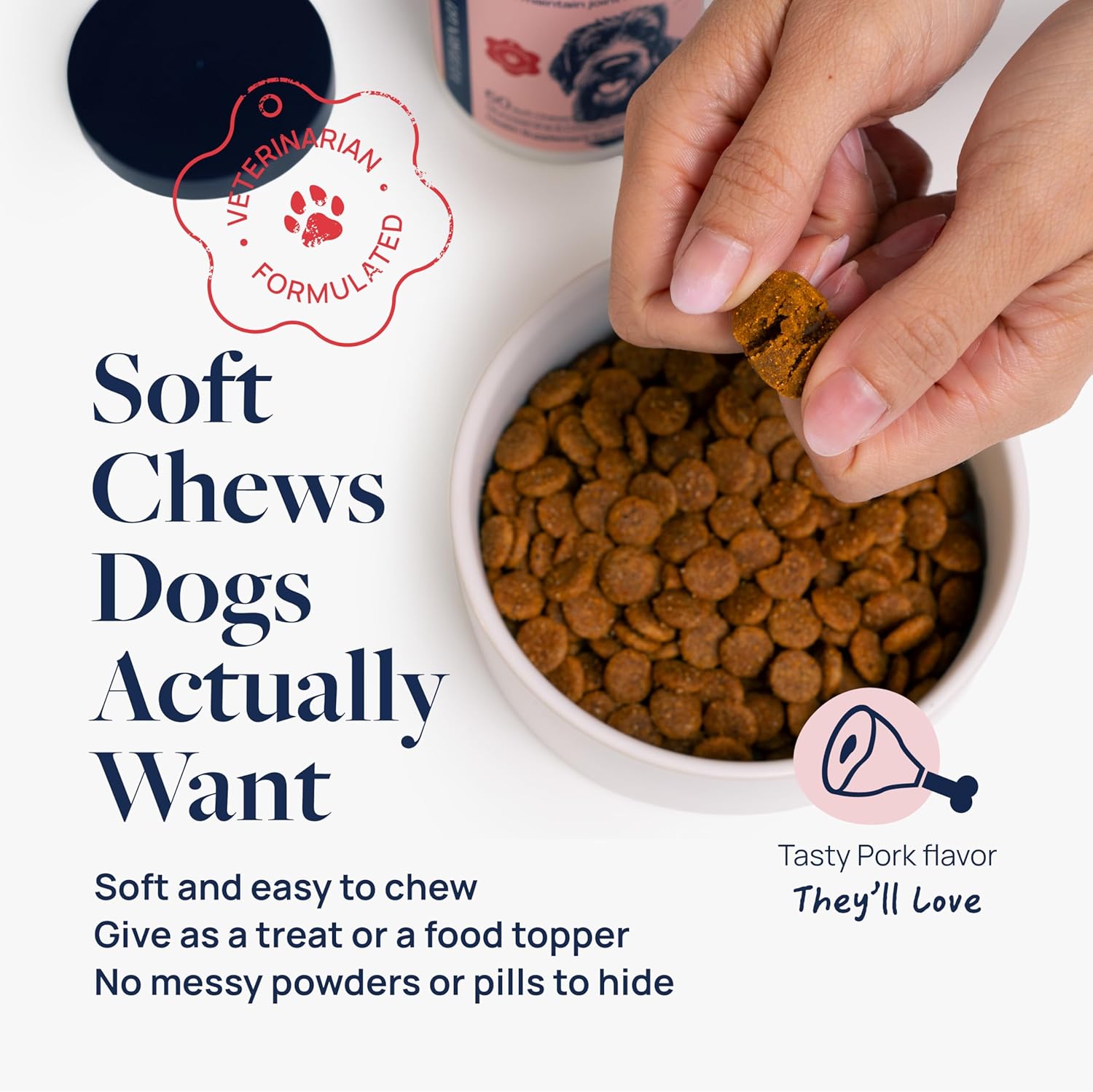 • VET-FORMULATED & TASTY - This delicious pork-flavored hip and joint chews for dogs was formulated by veterinarians. No pills, powders, artificial flavors, or preservatives — just an easy-to-give hip and joint supplement dogs will love.