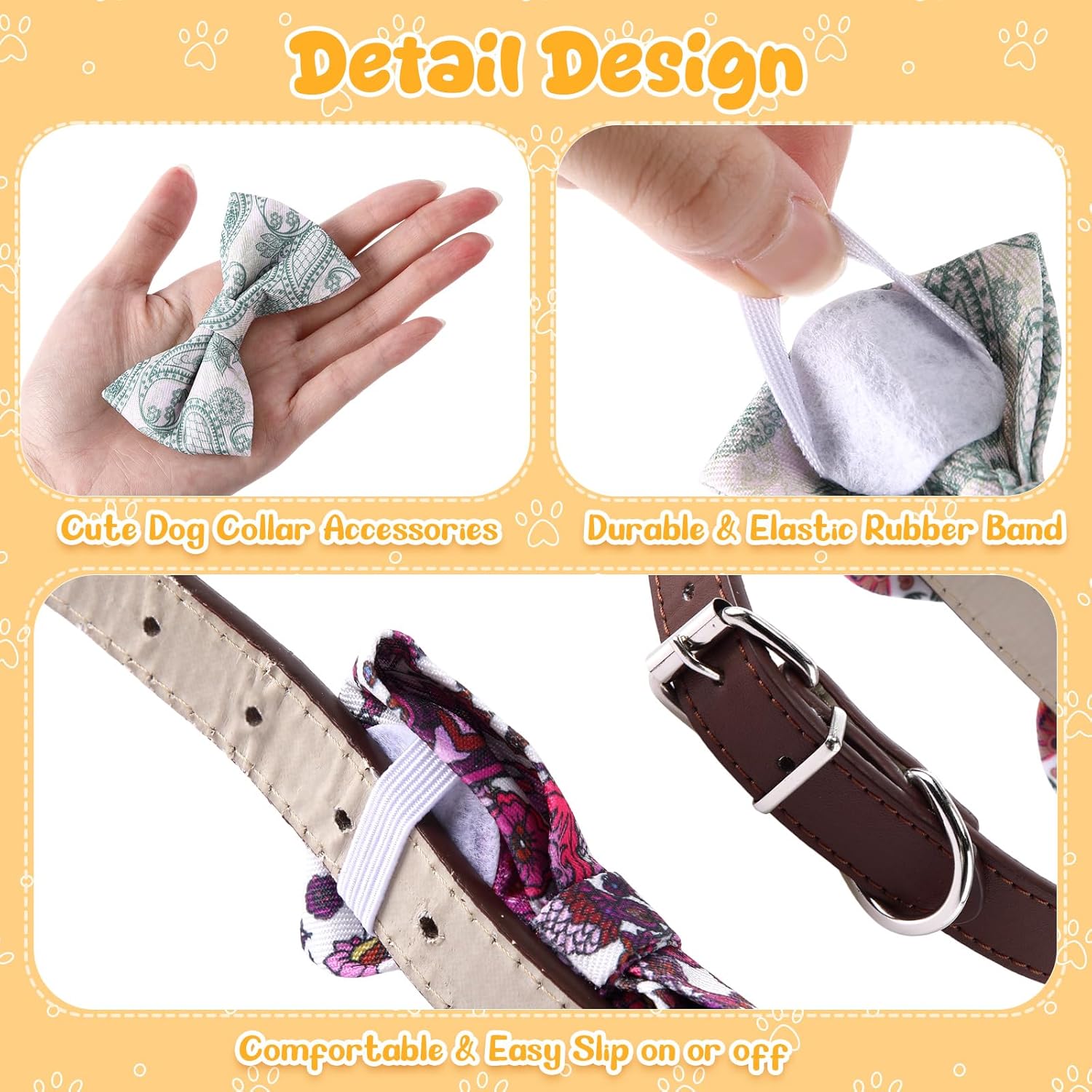 • Detachable Design: dogs collar attachment bow ties are designed with gaskets and rubber bands, which are elastic and wide enough to move to the position you want; These dog collar bows ties with cute patterns and various colors can be easily changed to bring more fun and different looks