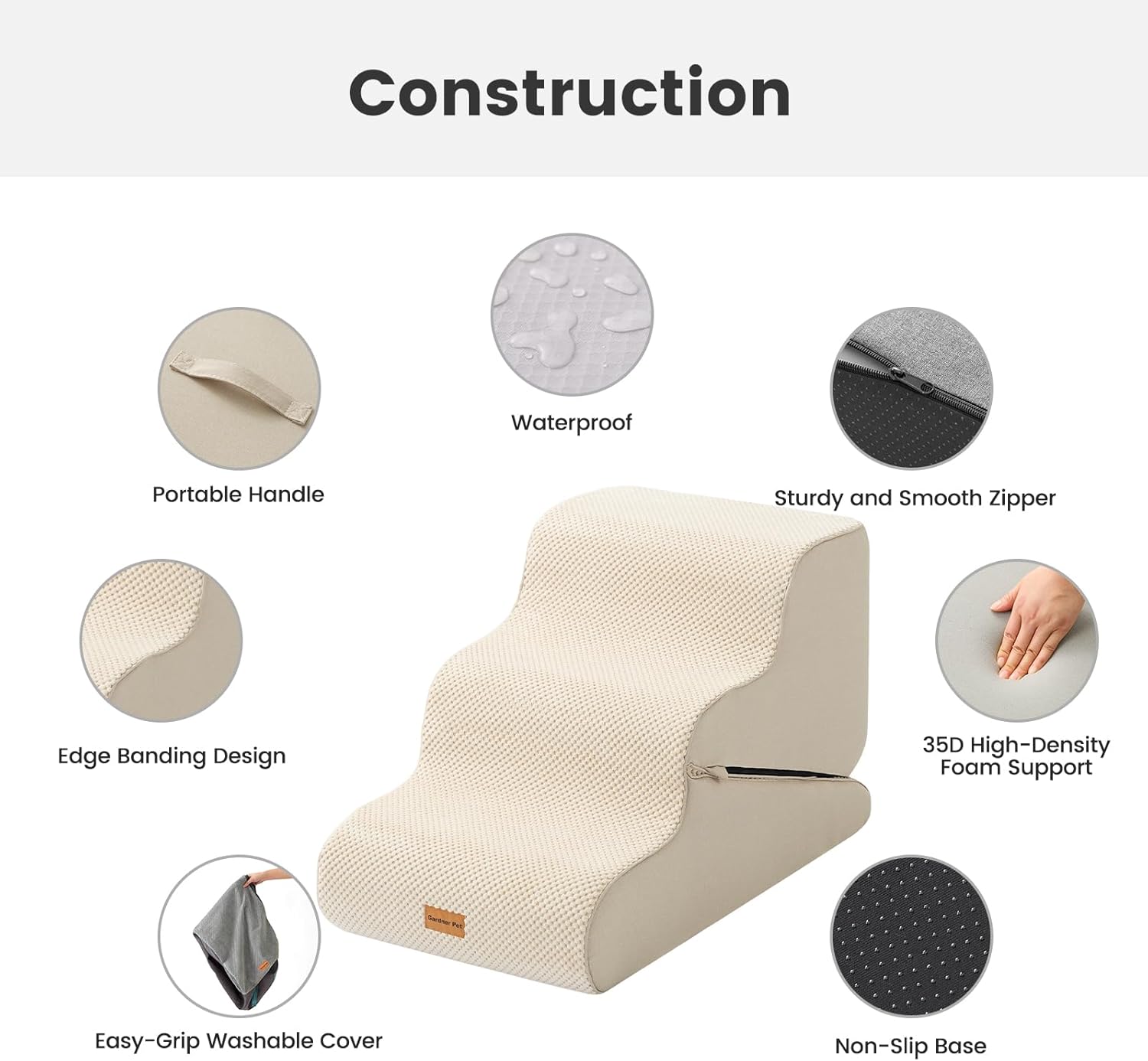 - 35D High-Density Foam: These pet stairs features a soft, low-angle ramp design with 35D high-density foam, providing optimal support and reducing stress on your dog's joints. Ideal dog stairs for small dogs and medium dogs, especially those with knee injuries or older pets who need extra care.