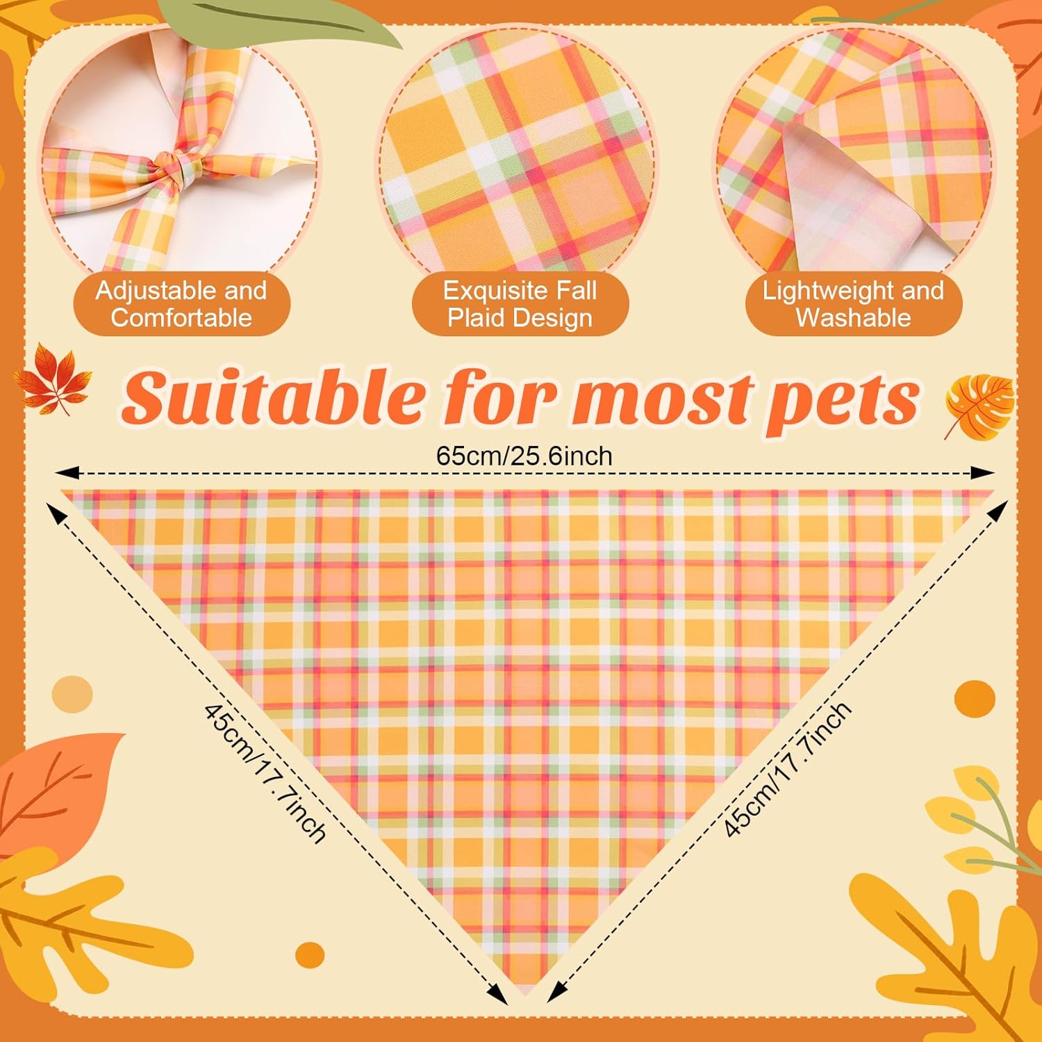 • Plaid Design: our Fall Dog Bandanas bulk are printed with a variety of orange Plaid designs, with bright colors and clear print, full of lively and active Autumn atmosphere, making your dog more charming in the crowd