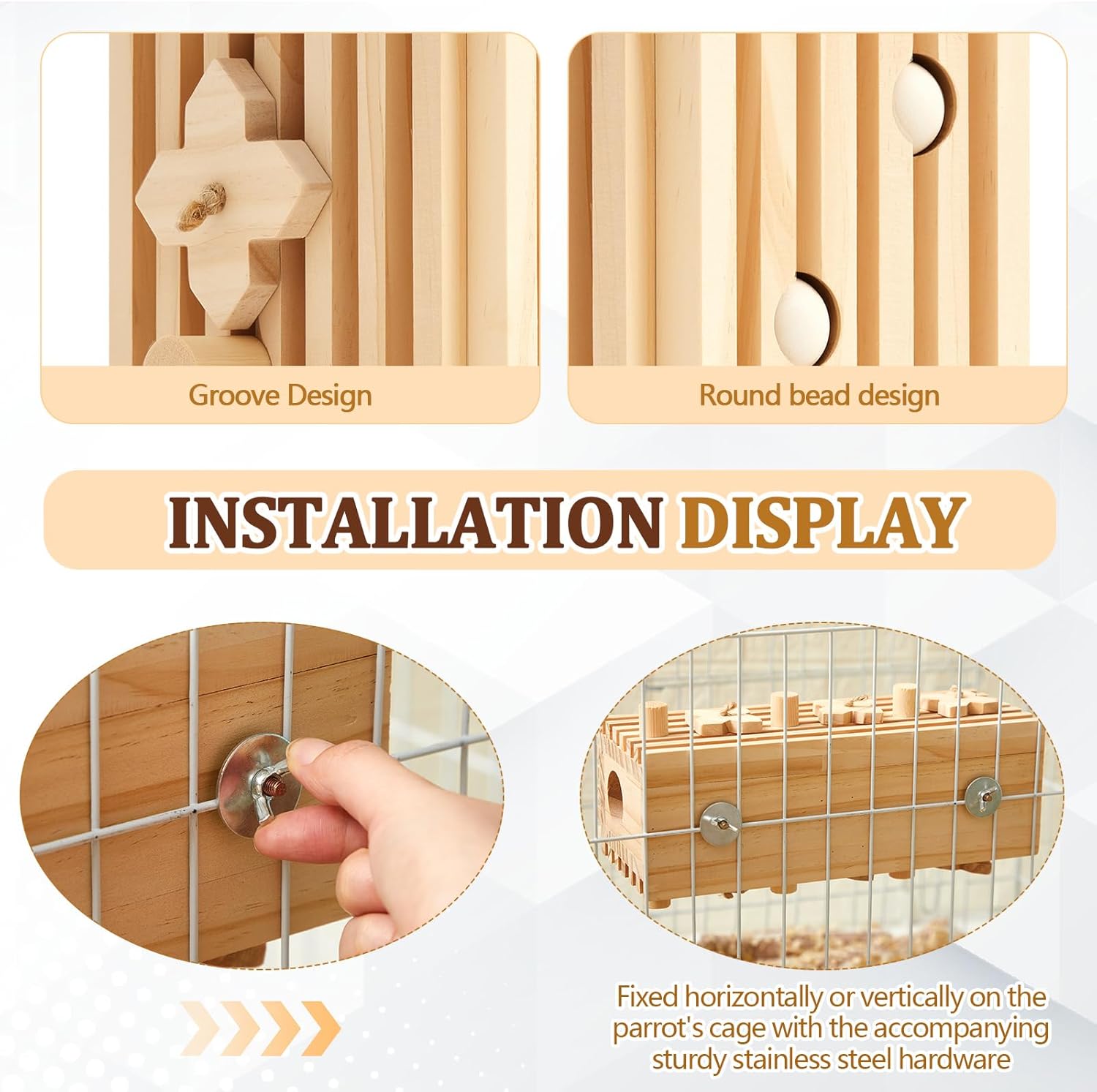 • Wood's Natural Character: due to natural differences in wood, color and appearance may vary; This toy includes a variety of wires, holes, beads and other accessories, which can be fixed to the cage bars using the included stainless steel accessories; It provides rich chewing fun and various activities for large parrots