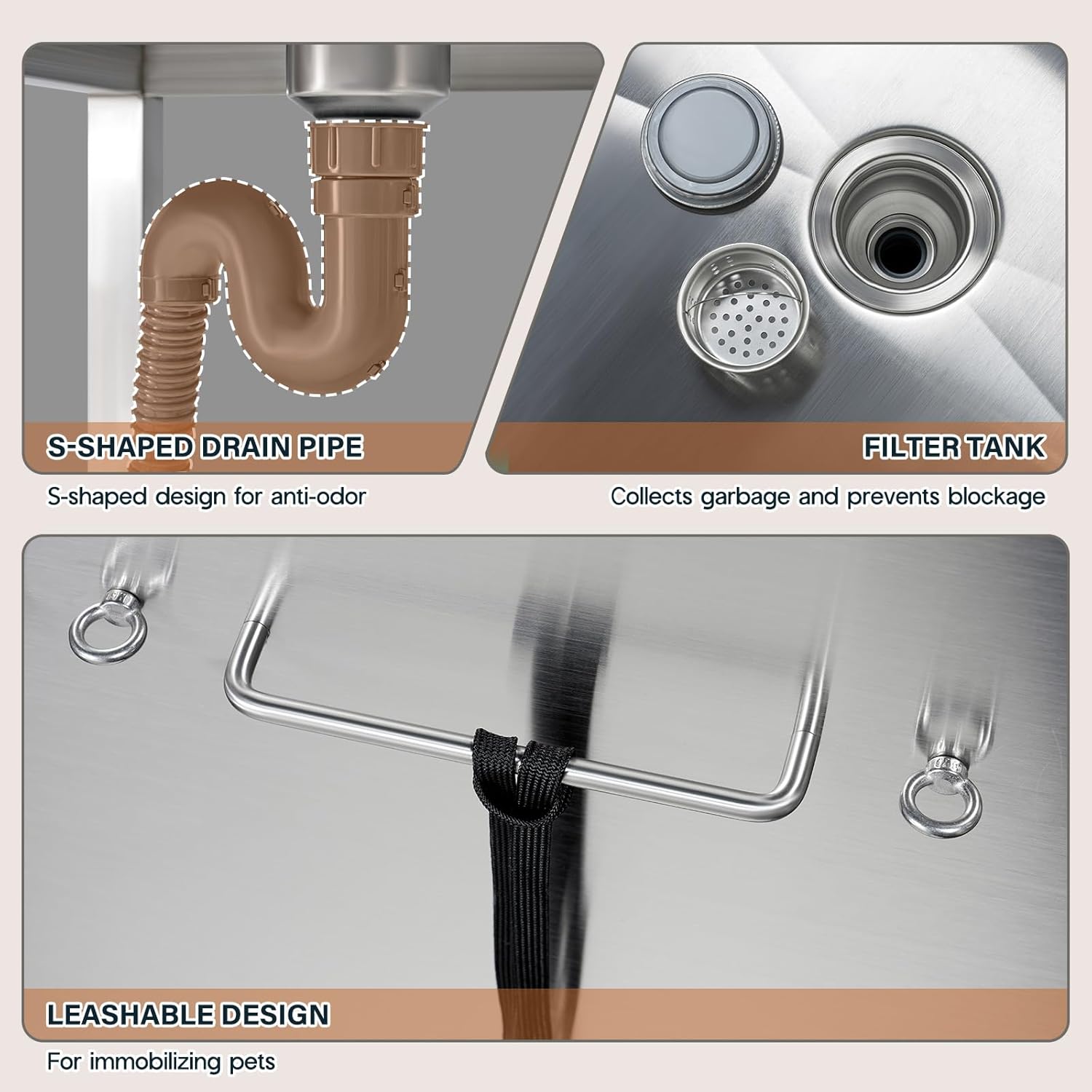 • Removable Drainage Board: The pet bathtub includes a height-adjustable and removable drain board that supports up to 550 lbs, providing safe grooming for pets of different sizes. Anti-slip pads add extra stability.