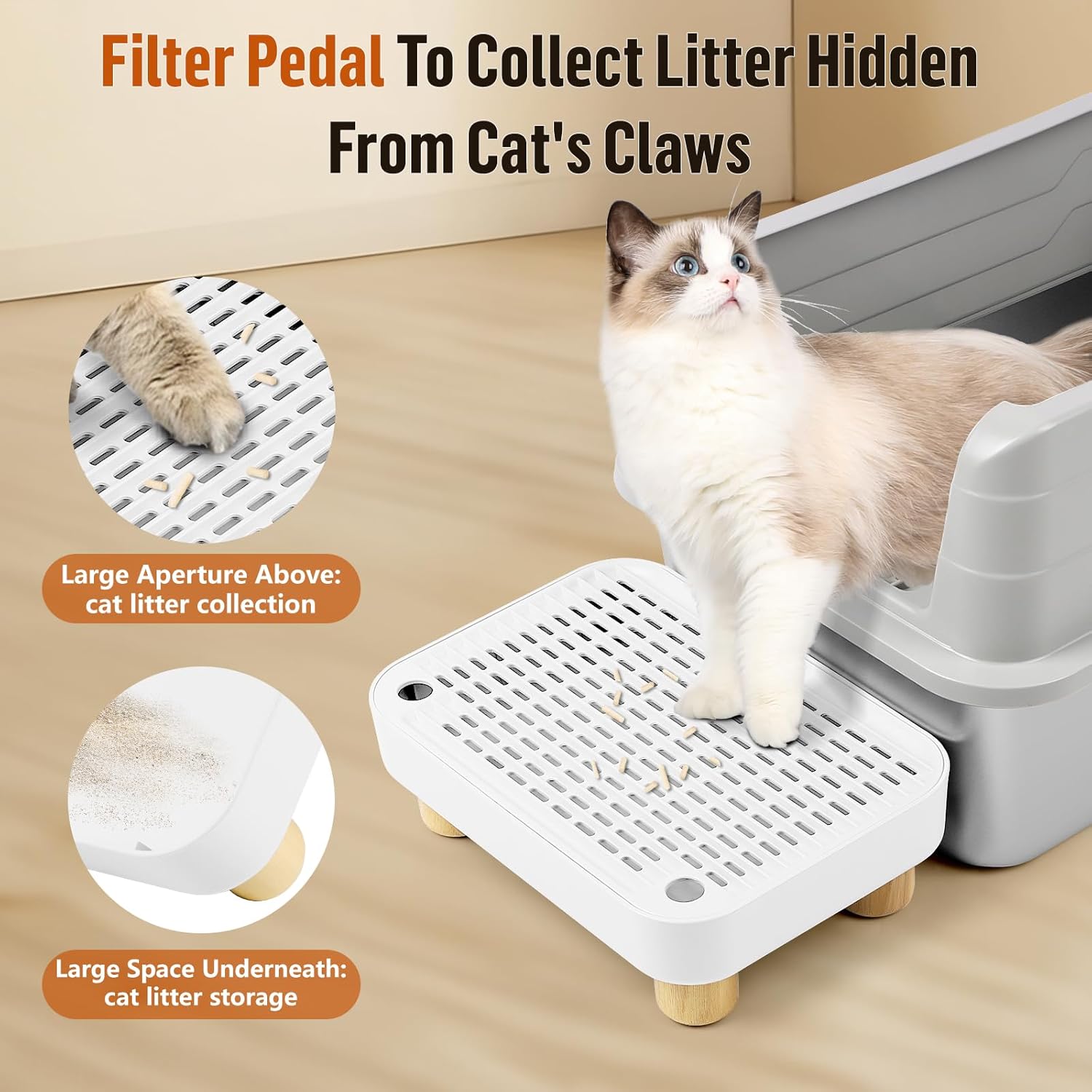 • Easy to Clean: The cat litter tray stair features large aperture plastic panel and a curved litter leakage opening. This design can collect cat litter hidden in cat paws and quickly open the filter pedal for easy cleaning.