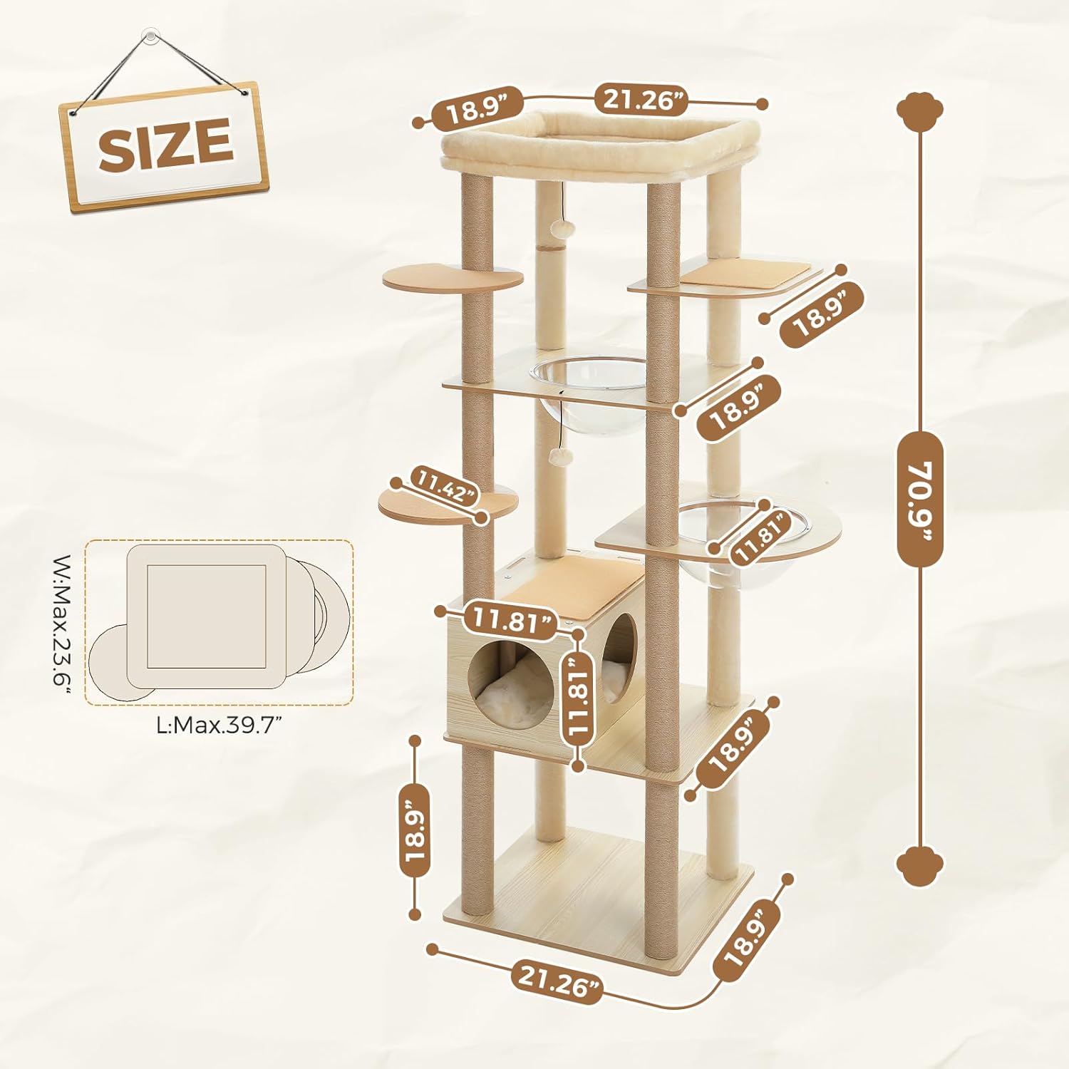 PEQULTI 71'' Cat Tree, Tall Wood Cat Tower for Indoor Cats with 2 Acrylic Cat Hammock, Multi-Level Activity Trees with Scratching Posts, Condo House and Large Top Perch for Large Cats, Beige