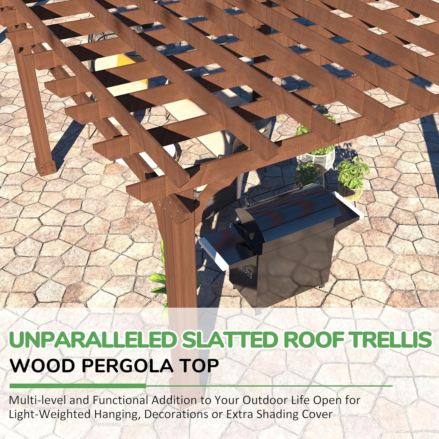 - FLATED ROOF PAVILION - Our pergola features a flat roof design, which adds beauty and elegance addition to your garden and provides ample sunlight. Depending on your needs, you can add an extra cover to the top of the pergola for more shade or rain protection. With a traditional antique exterior design, this outdoor pergola with a rustic look matches most outdoor decorations, while also being great for growing grapevines or climbing flowers.