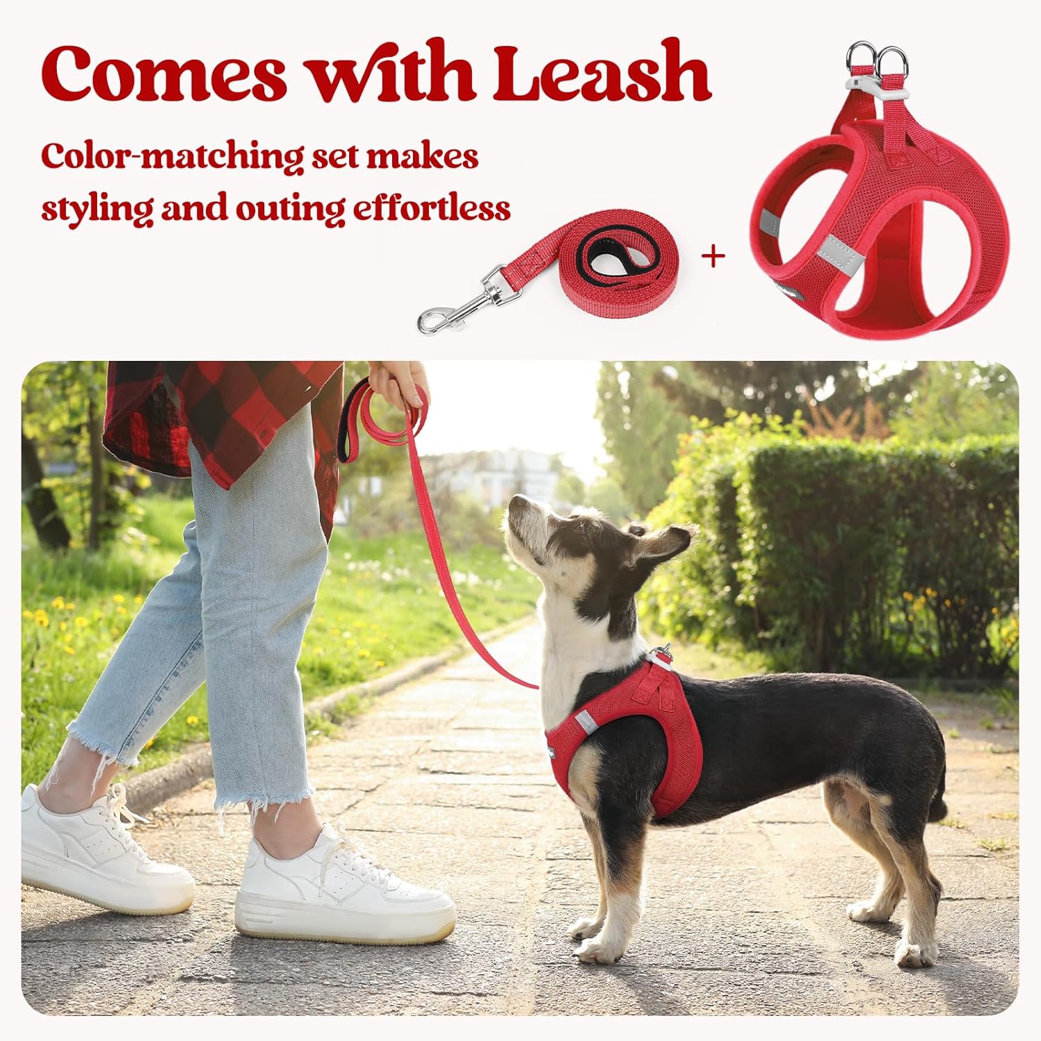 • Dog Harness with Leash Set:The color-matching harness and leash with reflective bands make it fashion and visible for pet outing. The leash is 5.15ft in length, with an anti-tangling clip and a palm-friendly handle