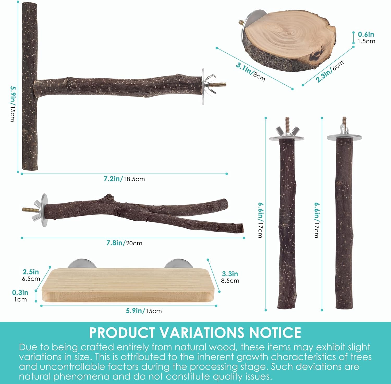 • Bird Cage Accessories: Natural perches for parakeets set includes 1 Combo T-Shaped Bird Perch, 1 Round Parrot Platform, 1 Y-Shaped Perch, 1 Rectangular Perch Platform, and 2 Wooden Perches Stand. Note: Due to the fact that the perches are made of natural apple wood, individual shapes may vary