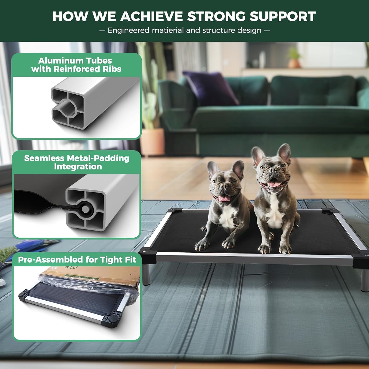 • Indestructible & Dog-Safe: Crafted with a premium aluminum alloy frame and chew-proof edges, this bed withstands aggressive chewers while keeping your pup’s gums safe and happy.