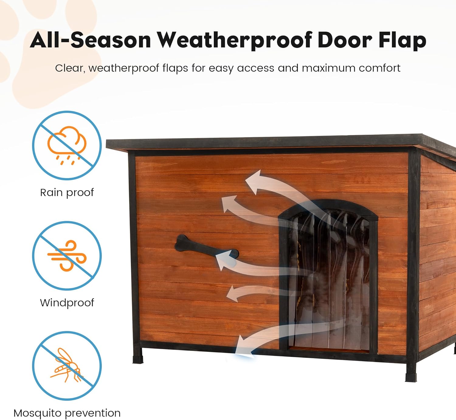 • [Specially Designed for Outdoor Use] The sloping asphalt roof is expertly engineered to prevent rainwater from pooling, ensuring that your pet's living space remains dry and comfortable. The floor is 2.4’’ above the ground, and there is a removable PVC curtain and adaptable floor pads for uneven ground. This design enables the dog house to withstand harsh weather conditions, preventing water from seeping in and materials from getting damp