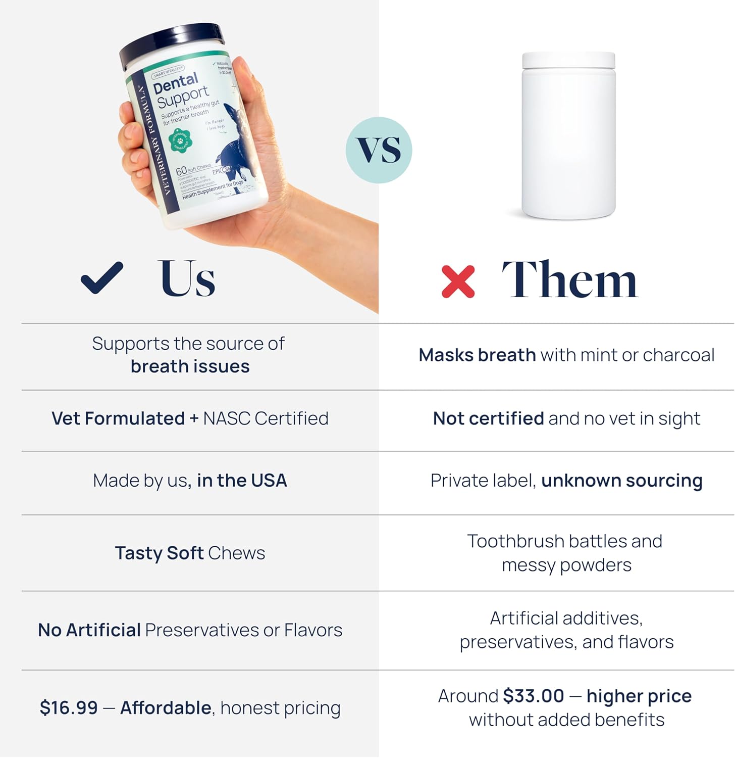 • DENTAL SUPPORT FOR DOGS – Smart Vitality Dental Health Supplement supports fresh breathand ongoing oral health in dogs. These soft chews are ideal for daily use, helping maintain clean teeth and a healthier mouth as part of your pet’s wellness routine.