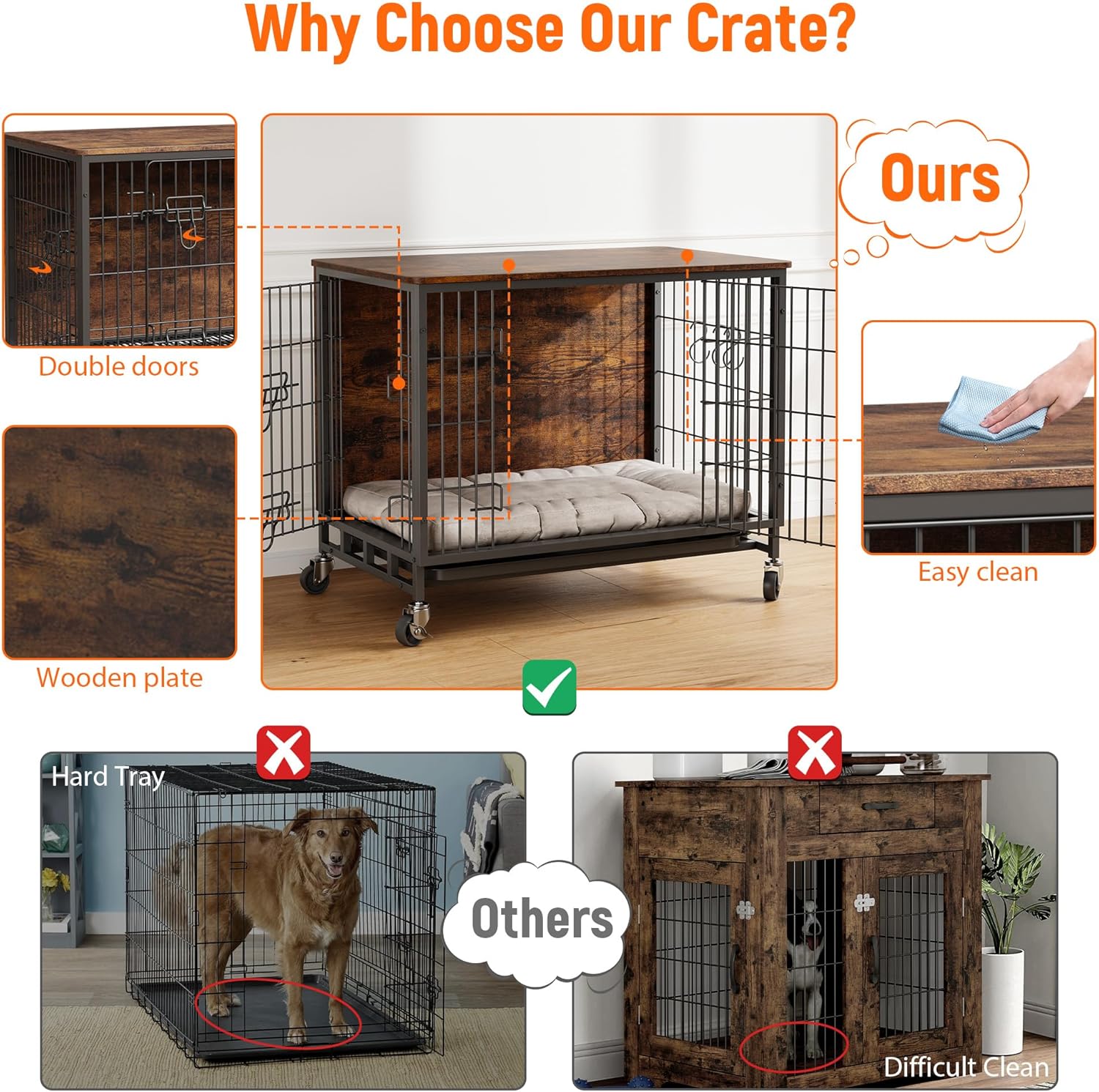 - 【Convenient Double Door Design】The dog kennel features a practical double door setup with front and side access, simplifying entry and cleaning. Its side door can be tailored to open on either the left or right, perfectly adapting to your home’s layout and enhancing the overall utility of the dog crate furniture.