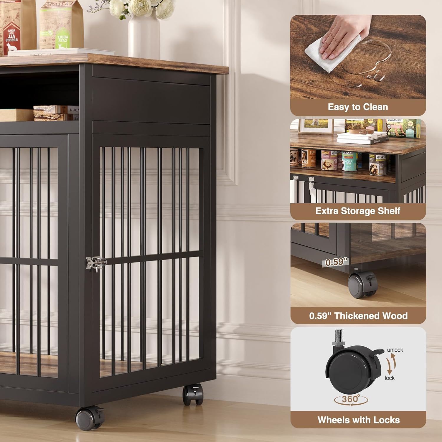 • Furniture-Style Dog Kennel:With a storage shlef, it serves as both a stylish dog crate and a practical side table. It provides space to store dog supplies and decorate your house at the same time! Equipped with 360° lockable wheels, you can easily move it around your house for different needs.
