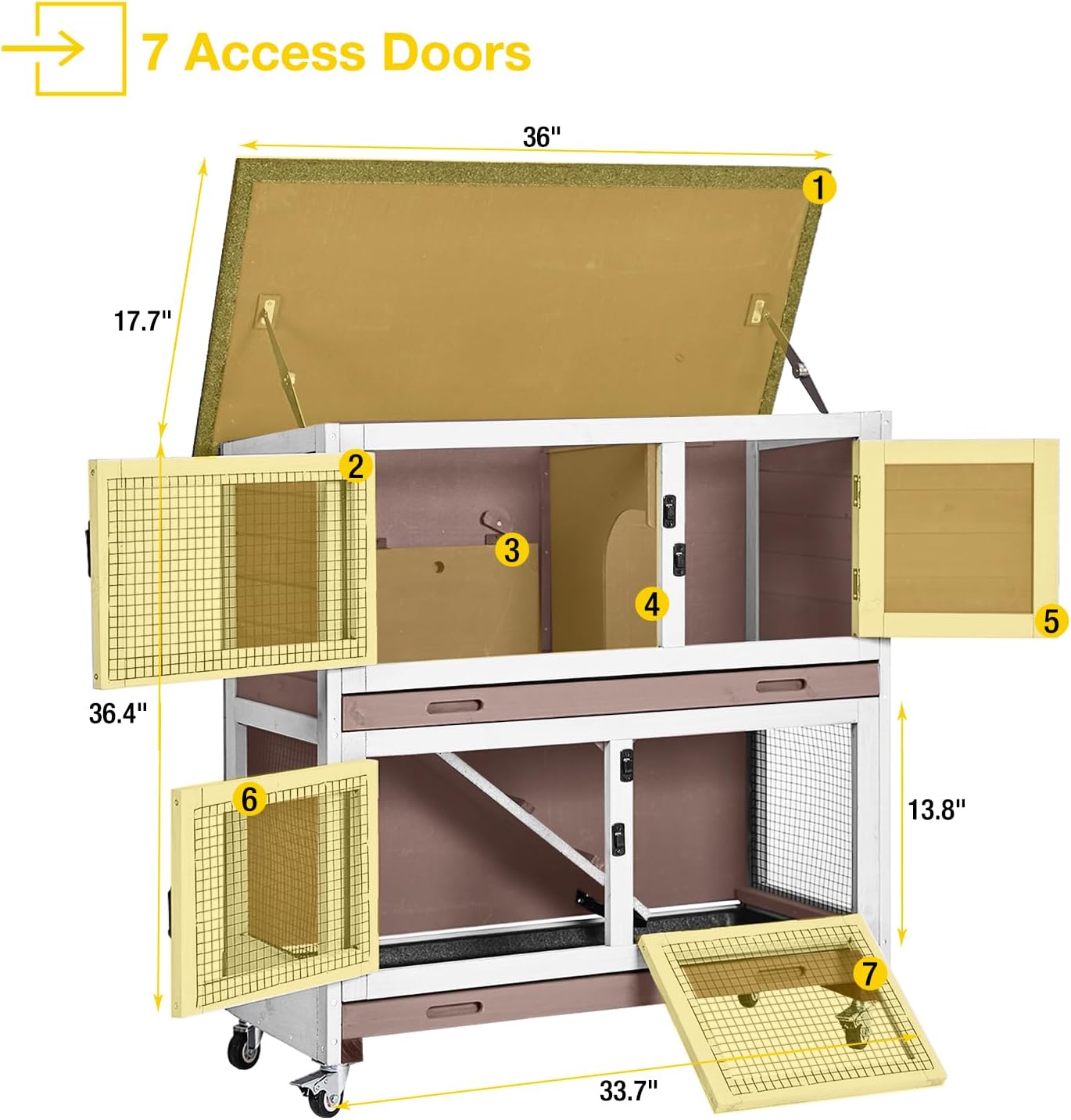 • Multiple Access Points for Convenience: With seven access doors, this hutch offers easy access to all compartments. This design makes cleaning and feeding your rabbits more convenient and efficient