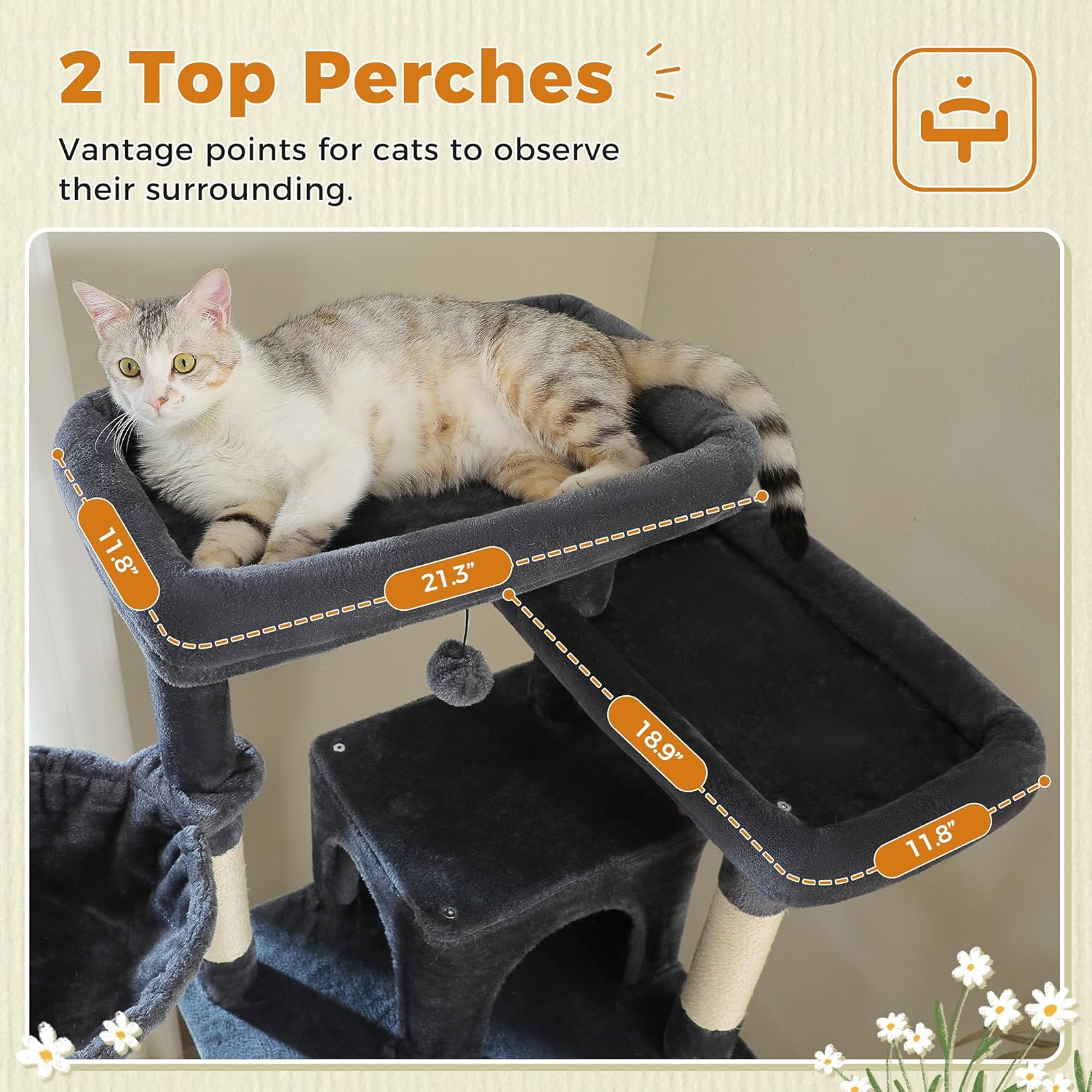 • 2 Large Top Perches: This adult cat tower with scratching post features 2 large top perches, perfect for Maine Coon and large adult cats up to 20lbs. The multi-level design offers climbing space for indoor cats in multi-cat households.