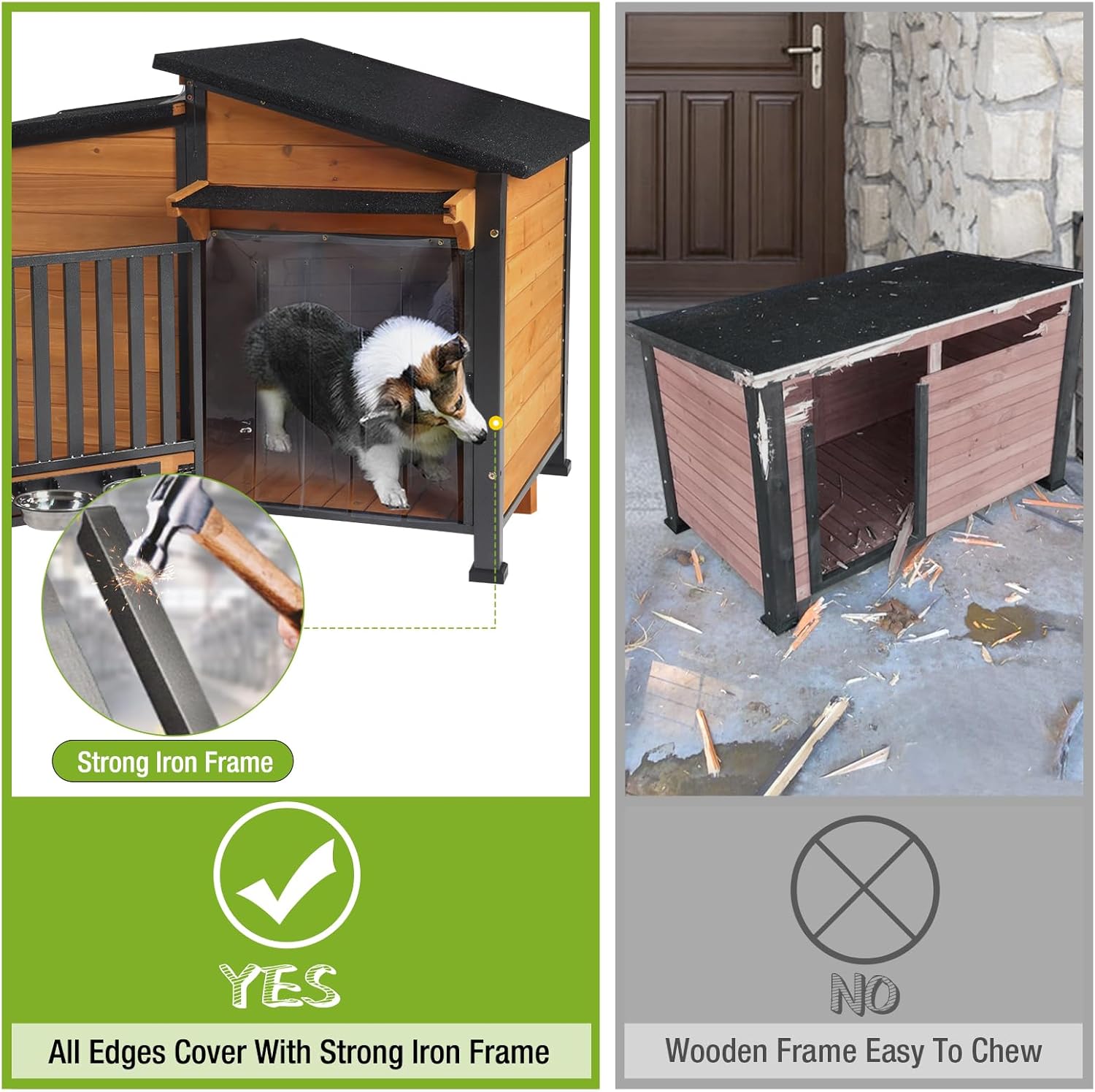 • Reinforced Metal Frame: Each wooden panel is fully framed with heavy-duty metal and secured by metal connecting bars, making the structure far stronger than thin aluminum trims or plain wood dog house