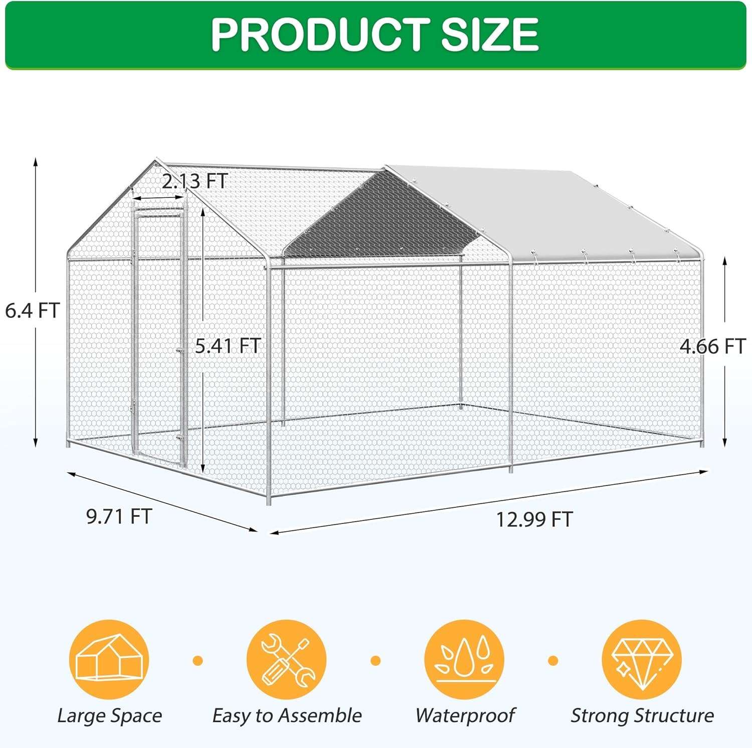 • 🐤STURDY& DURABLE: Our chicken coop is made of upgraded reinforced galvanized steel pipes with a thickness of 0.9 mm, which are strong, more durable and long-lasting than others(0.7 mm thick) . Secure hexagonal wire mesh ensures your chickens won't escape, creating a safe and comfortable outdoor space for your poultry