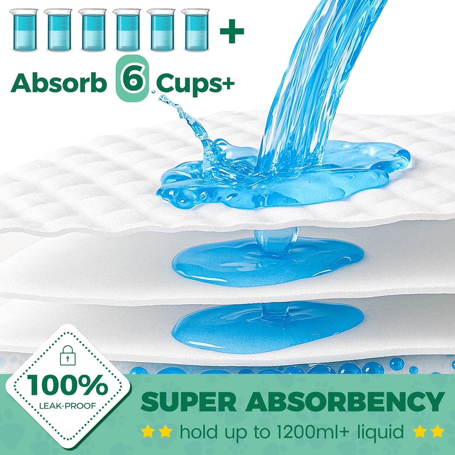• SUPER ABSORBENT DOG PEE PADS: Extra large pee pads for dogs with super absorbent polymer(SAP) technology are more absorbent than previous dog potty pads, the water absorption capacity of each xlarge puppy pad above 1200+ milliliters (hold up to 6 cups or more of liquid)– keeps paws dry and floors stain-free.