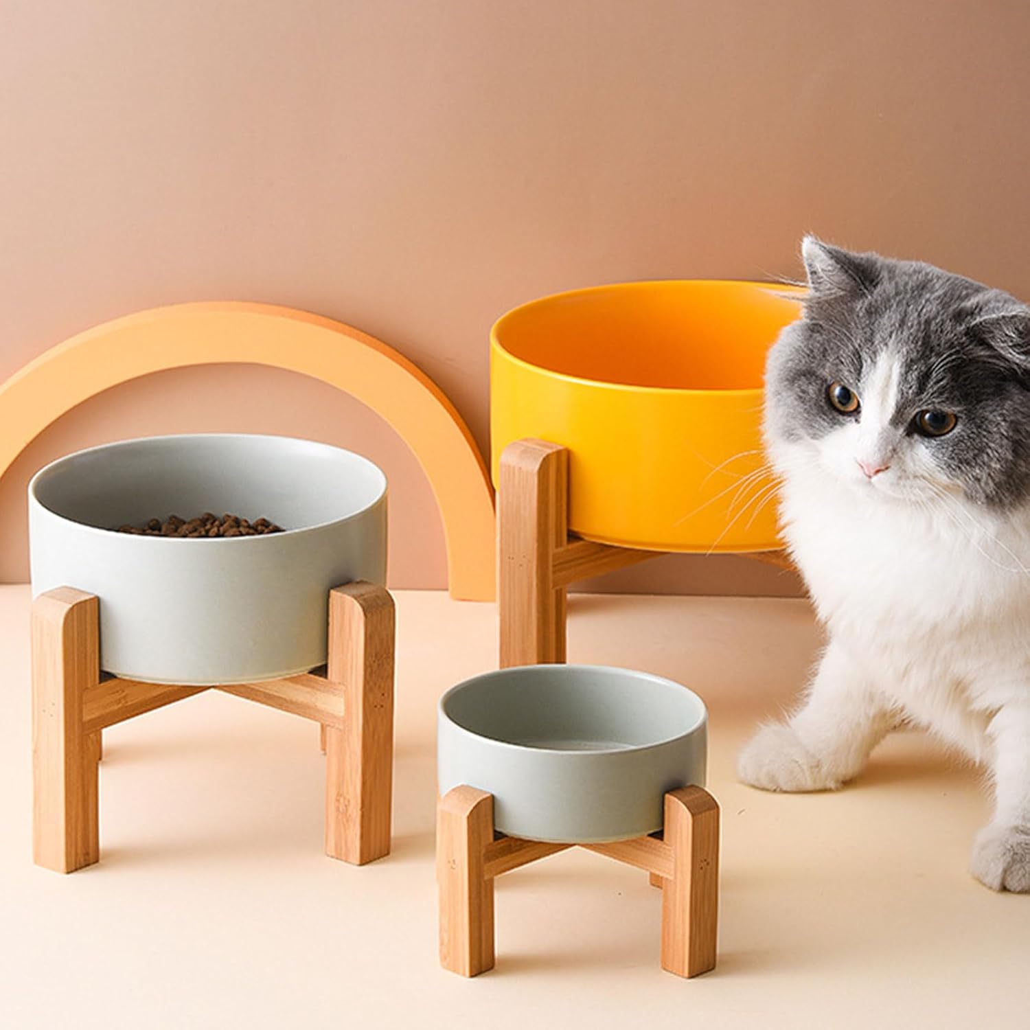 • NON SLIP WOOD STAND -You can get two different heights by flipping the bamboo stand,the elevated cat bowls are perfect for cats and small size dogs from different stages of childhood to adulthood, The wood stand on the bowls stopping ceramic cat dog bowl from sliding around, Keeps pet food and water in the bowls.