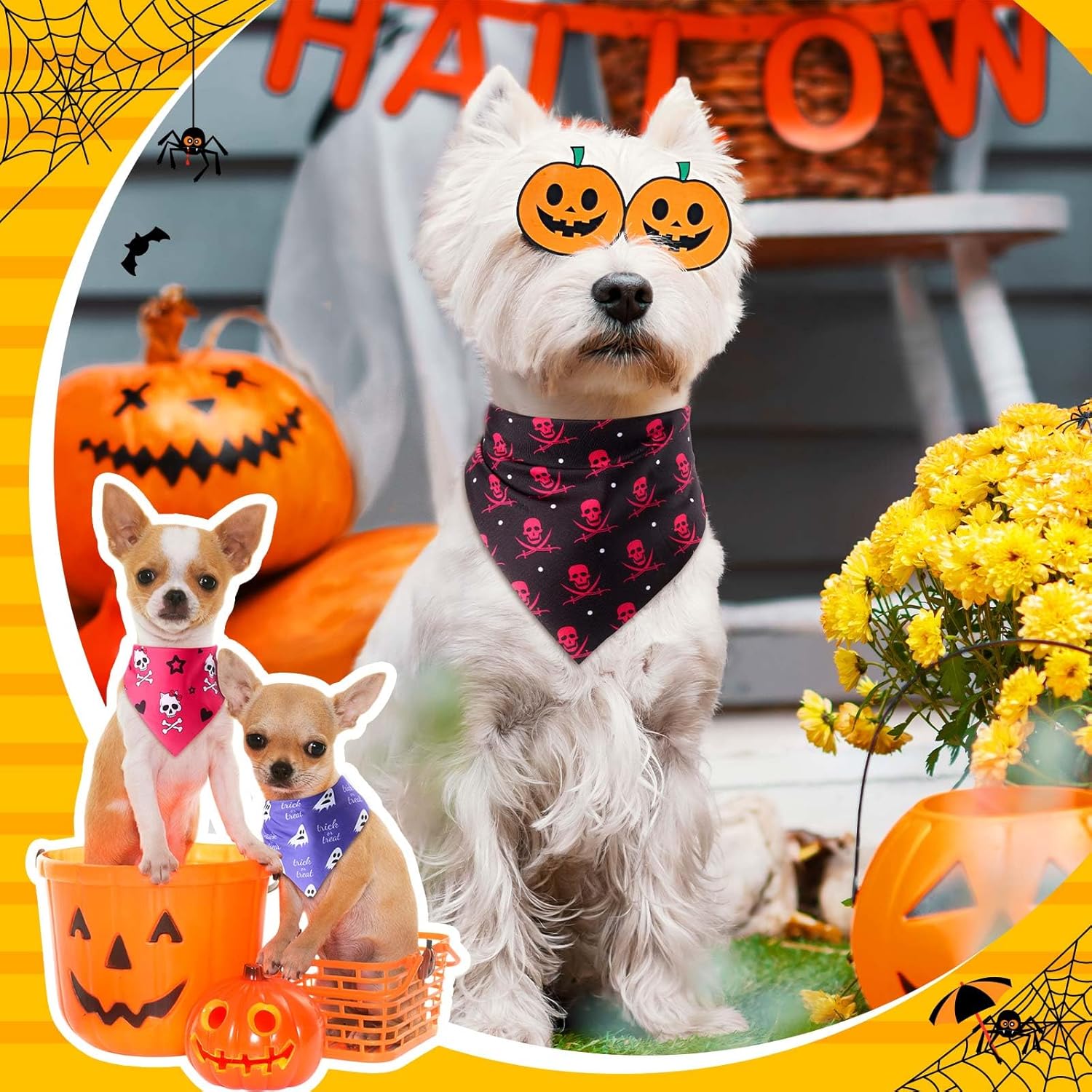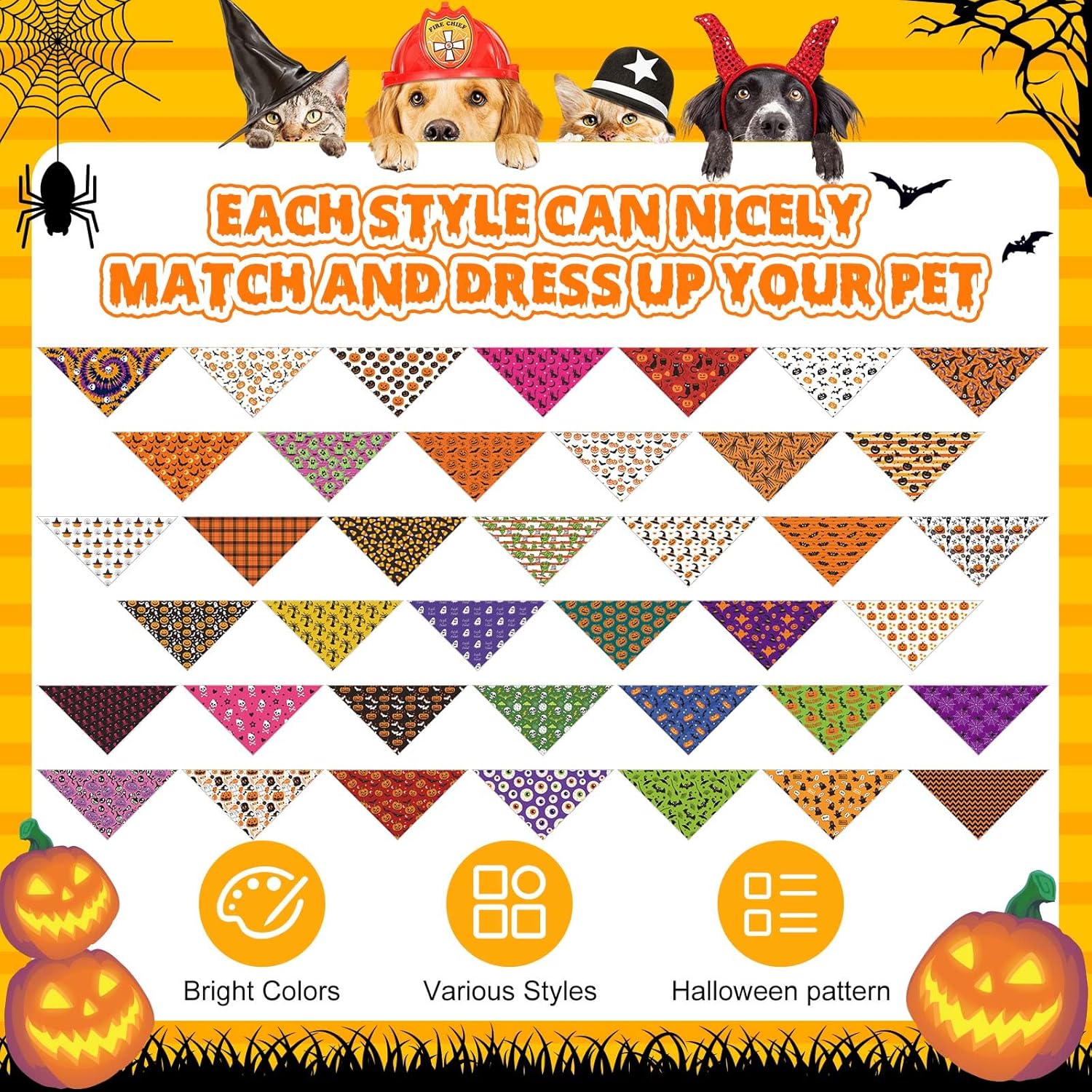 • Halloween Dog Bandanas Bulk: This bulk set includes 120 Halloween dog bandanas in 40 different styles, 3 pieces each, giving you plenty of variety for everyday wear, holiday photos, or party costumes. Share them with friends, shelters, or use as festive pet gifts