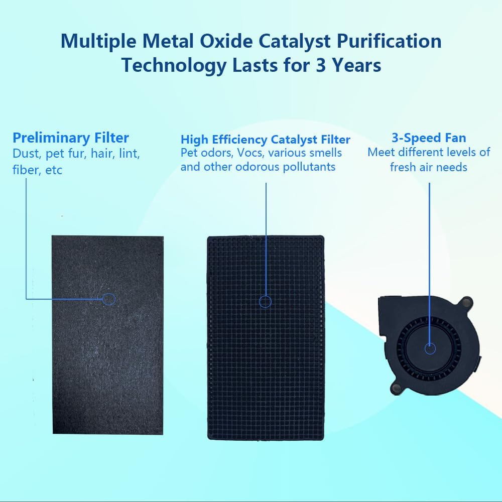 • Lasting for 3 Years: The cat litter deodorizer uses a high-efficiency catalyst activated carbon block filter with a service life of 3 years, which can remove odors from bathrooms, kitchens, pet rooms, basements and more.