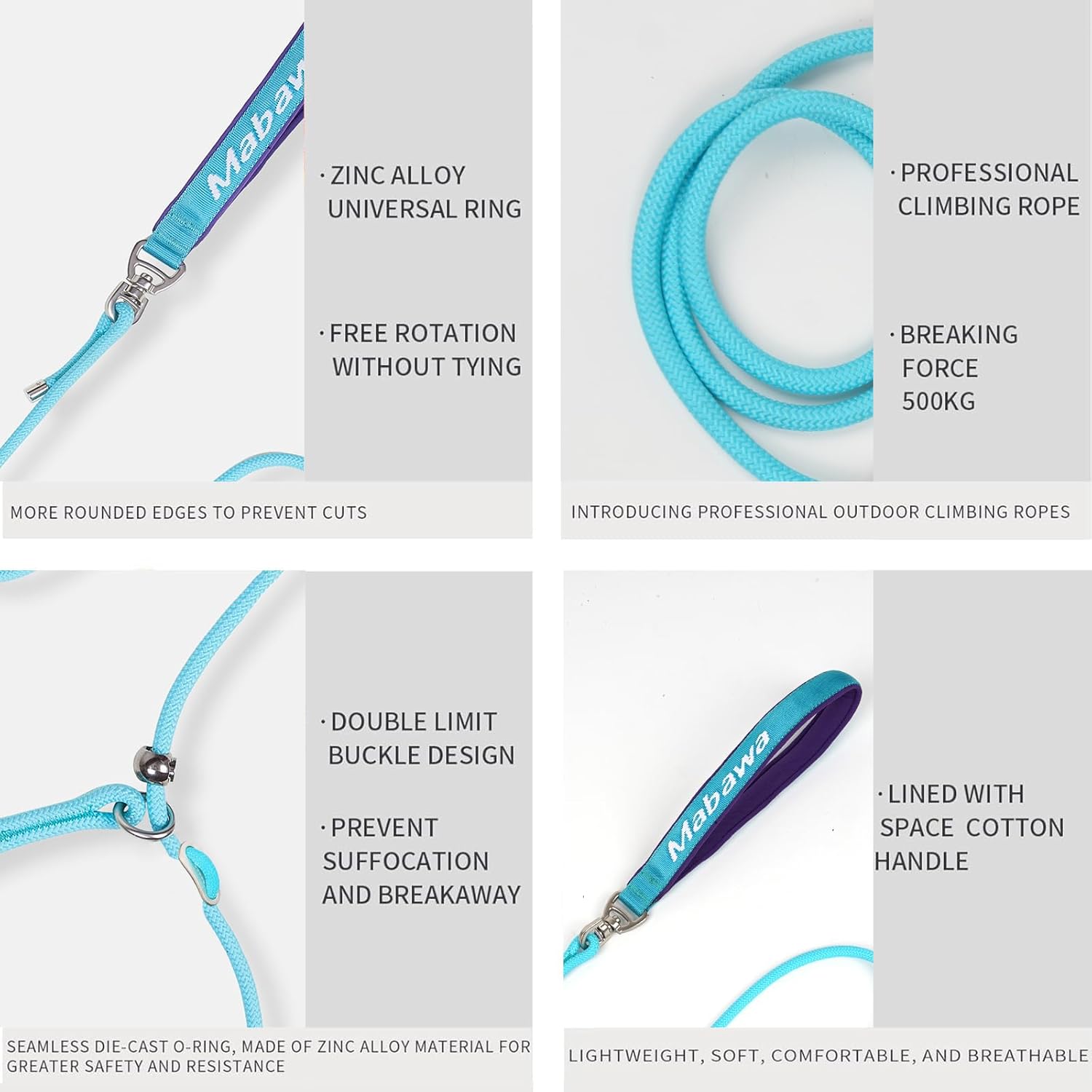 • 【Double Limit Design】: Heavy duty rope dog leash has 2 metal stoppers, which are anti-suffocation and anti-escape, and can easily stop the dog from pulling and will not cause harm to the dog. No-pull training, correcting bad behavior and controlling it in a short period of time, this chew proof leashes for dogs is effective for most dogs.