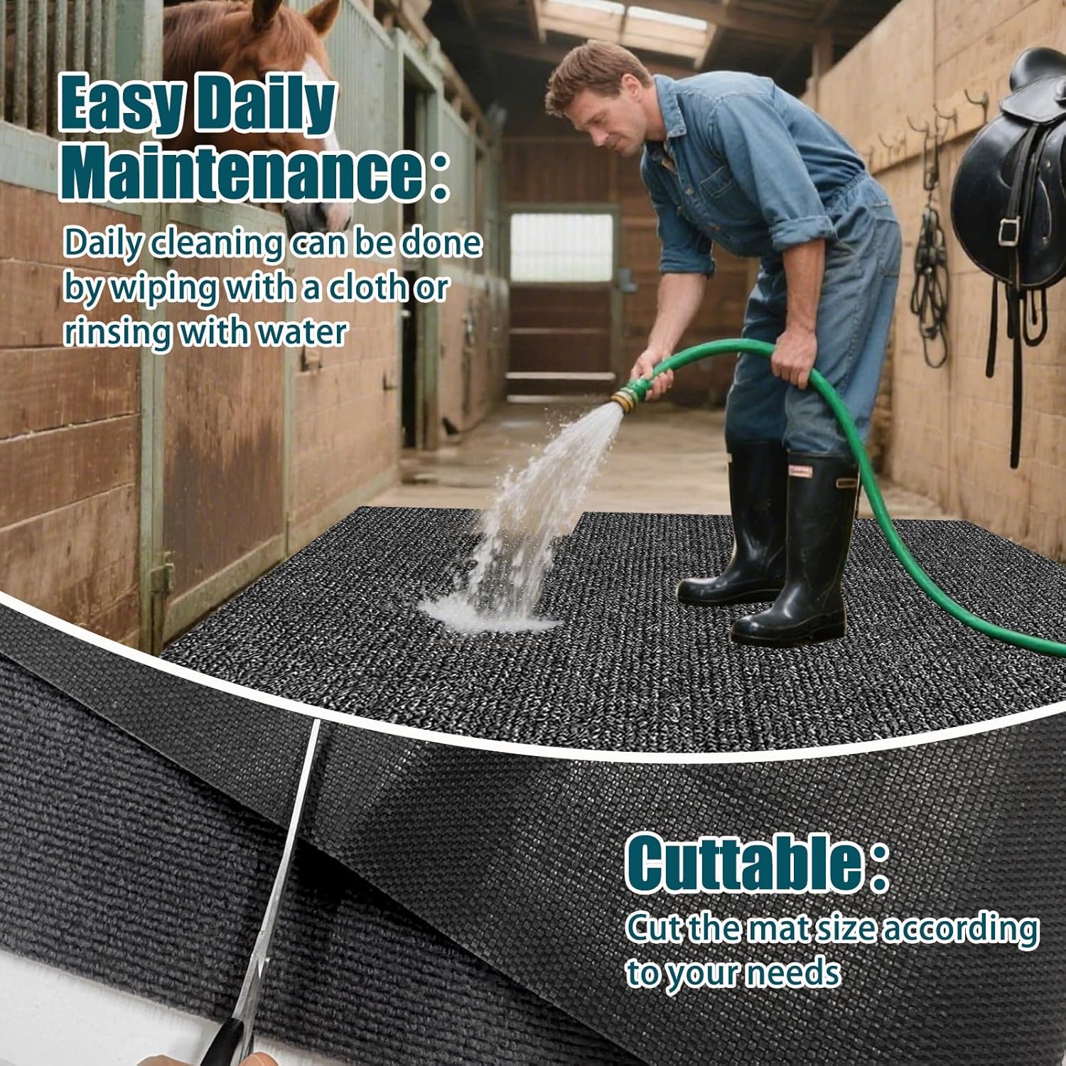 • Easy to Clean:Our stable bedding can be easily cleaned with water or a simple brush to remove stains and odours, requiring no complicated maintenance;The quick-drying material helps keep the stable clean and hygienic
