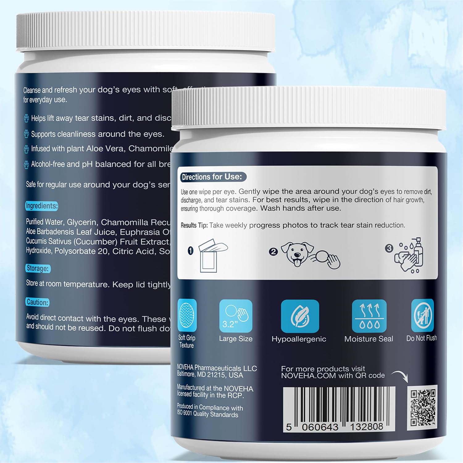 • 🌿INFUSED WITH NATURAL INGREDIENTS - Aloe Vera, Chamomile, Eyebright & Cucumber Extract. NOVEHA eye wipes for dogs are Alcohol-free and pH balanced for all breeds and coat colors.