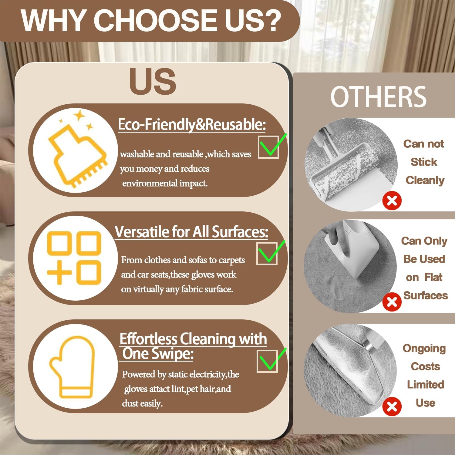 • 【Electrostatic Hair-Lifting Technology】Experience effortless pet hair removal with our electrostatic pet hair remover glove. The built-in static charge actively attracts and locks cat/dog hair from deep fibers, eliminating the need for sticky rollers or chemical sprays. Works instantly on contact - just glide your hand over surfaces!