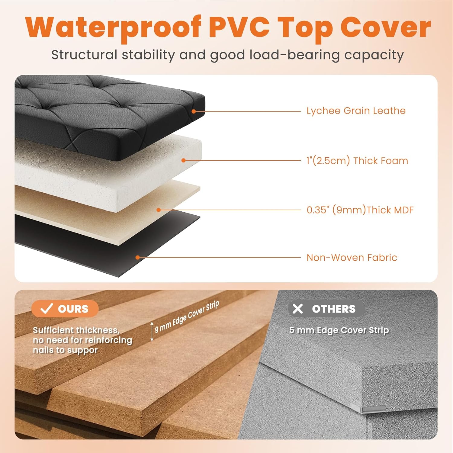 • 【Premium & Durable Build】The black Sweetcrispy storage ottoman features chic Lychee Grain Leather, while brown uses sleek Synthetic Leatherβ€”both super comfy and built to last. No flimsy stuff here! We use 4 layers of reinforced material with 9mm-thick edges, supporting up to 660 lbs without extra nails. Just sturdy Sweetcrispy quality!
