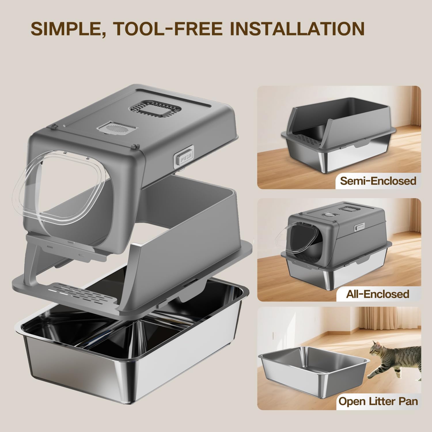 • Premium Stainless Steel Construction – Scratch-resistant and non-stick for effortless cleaning, offering superior durability and hygiene compared to traditional plastic litter boxes.