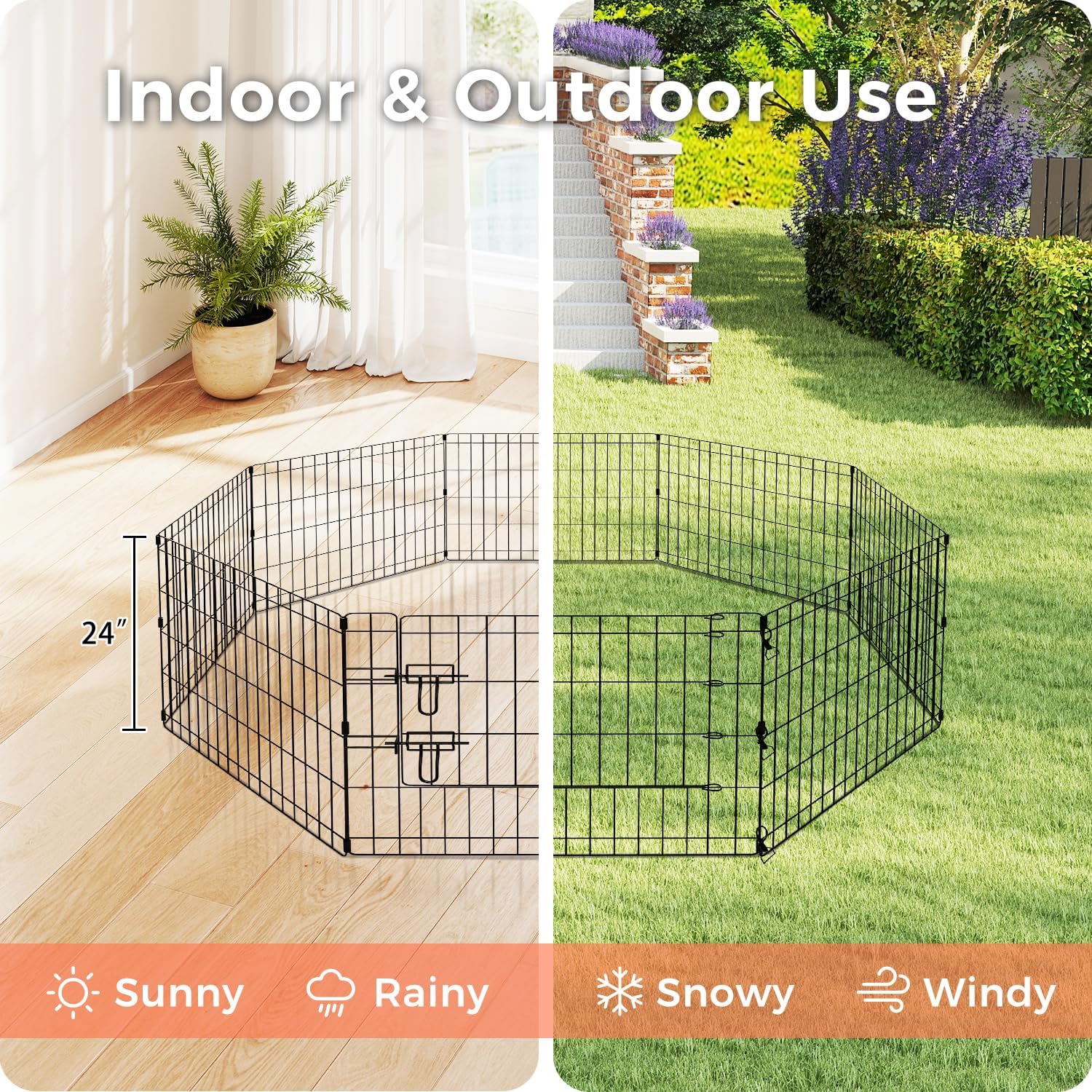 • Indoor/Outdoor Use: Constructed with rust-proof metal, this dog playpen outdoor withstands rain/snow/sun. Use as dog playpen indoor with rugs/mats, or secure with stakes as sturdy dog fence for yards/RV camping/patios.