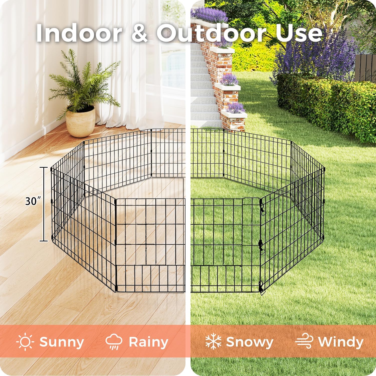 • Indoor/Outdoor Use: Constructed with rust-proof metal, this dog playpen outdoor withstands rain/snow/sun. Use as dog playpen indoor with rugs/mats, or secure with stakes as sturdy dog fence for yards/RV camping/patios.