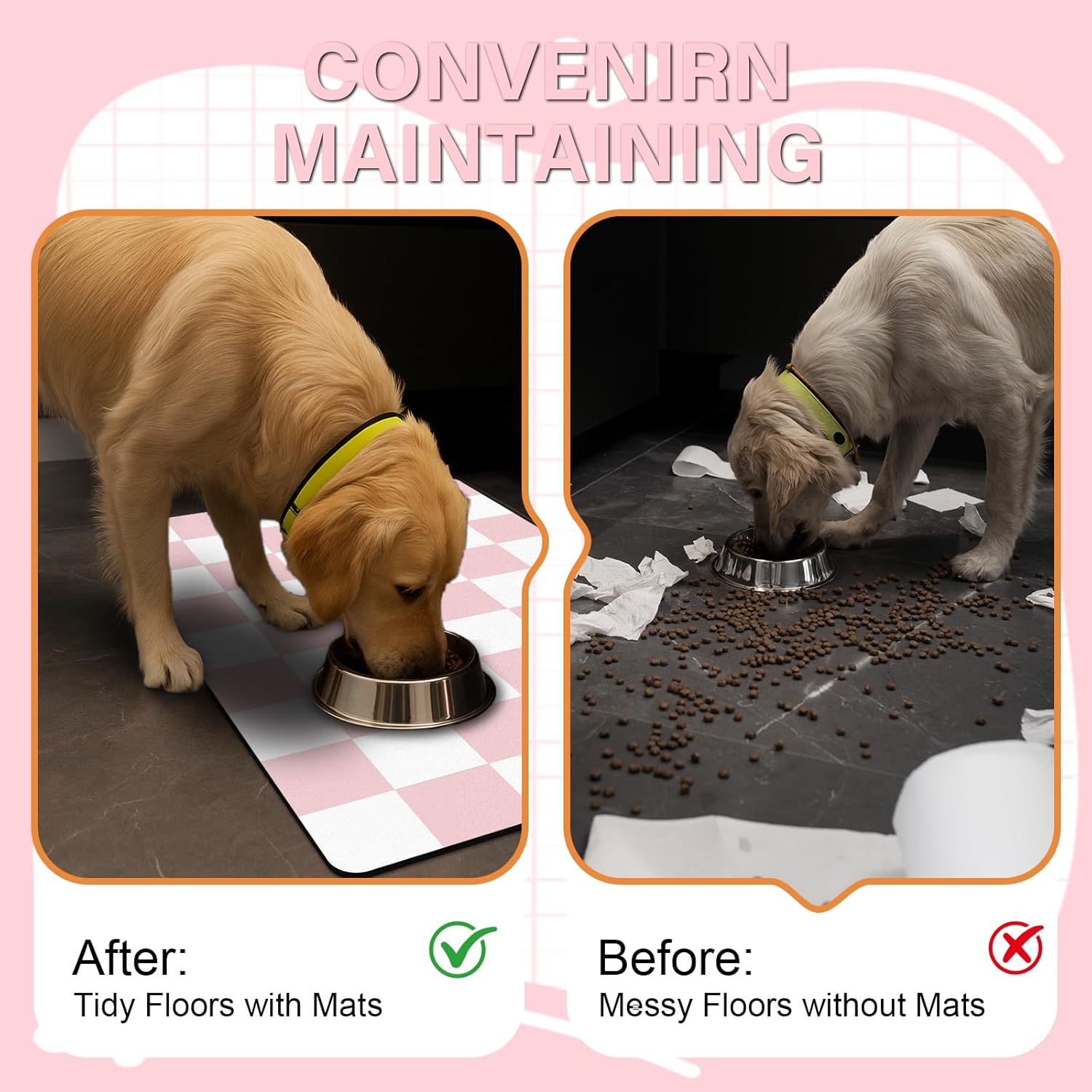 • Stylish Checkered Pet Feeding Mat Design: Elevate your pet’s feeding area with BLESWIN trendy checkered pet food mat! Simple and classy two-tone pattern pet placemat complements modern home aesthetics while adding a pop of color to any space. Perfect for pet owners seeking both functionality and interior design harmony