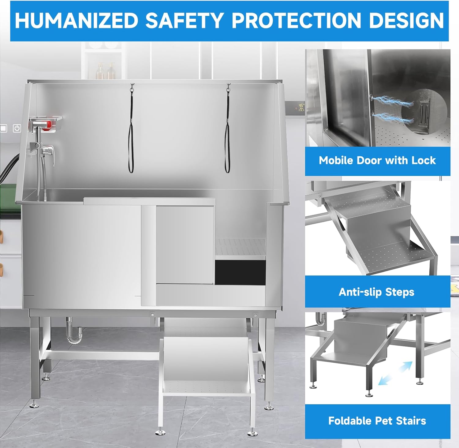 • 【HIGH-QUALITY MATERIALS】Our dog tubs for bathing are crafted with precision using durable 304 stainless steel. With an all-in-one design and leak-proof fully welded structure, our pet grooming & wash tub can prevent water leakage and odor backflow.