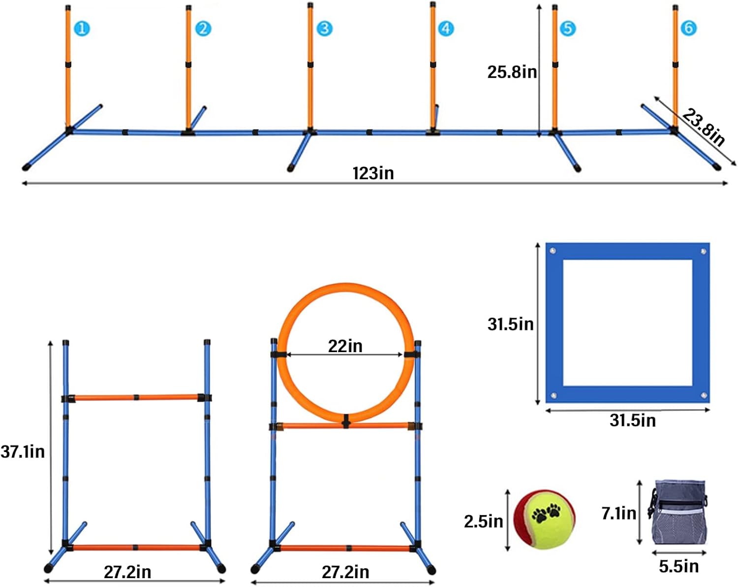 • THE IDEAL GIFT PACKAGE: This doggie agility set makes an exceptional gift for both young and seasoned dog lovers. It includes a square pause box, an adjustable dog agility jump hurdle with pole connectors, a tire jump, weave poles, agility equipment carrying bags, and an instruction sheet for your convenience.