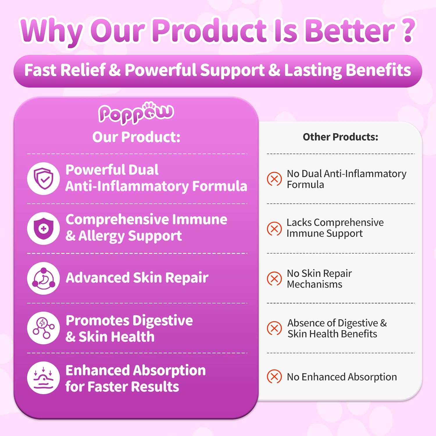 • Skin & Coat Health– Dog itching skin relief enriched with Omega-3, GLA, MSM, and bromelain to support skin hydration, elasticity, and a glossy, well-nourished coat