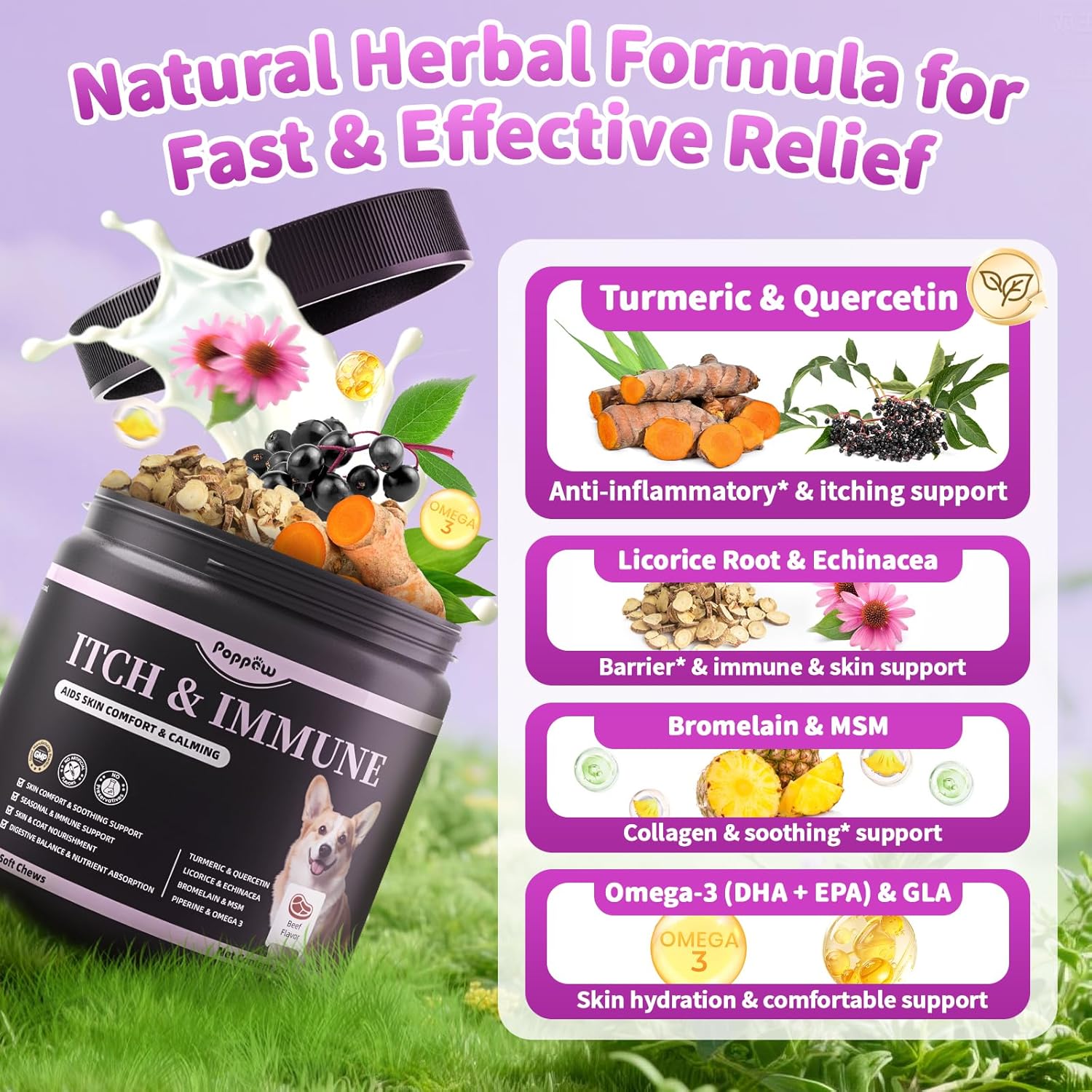• Skin Comfort & Soothing Care – Our dog allergy chews are formulated with turmeric and quercetin to help maintain skin comfort, ease occasional itching, and support dogs’ sensitive skin when challenged by scratching