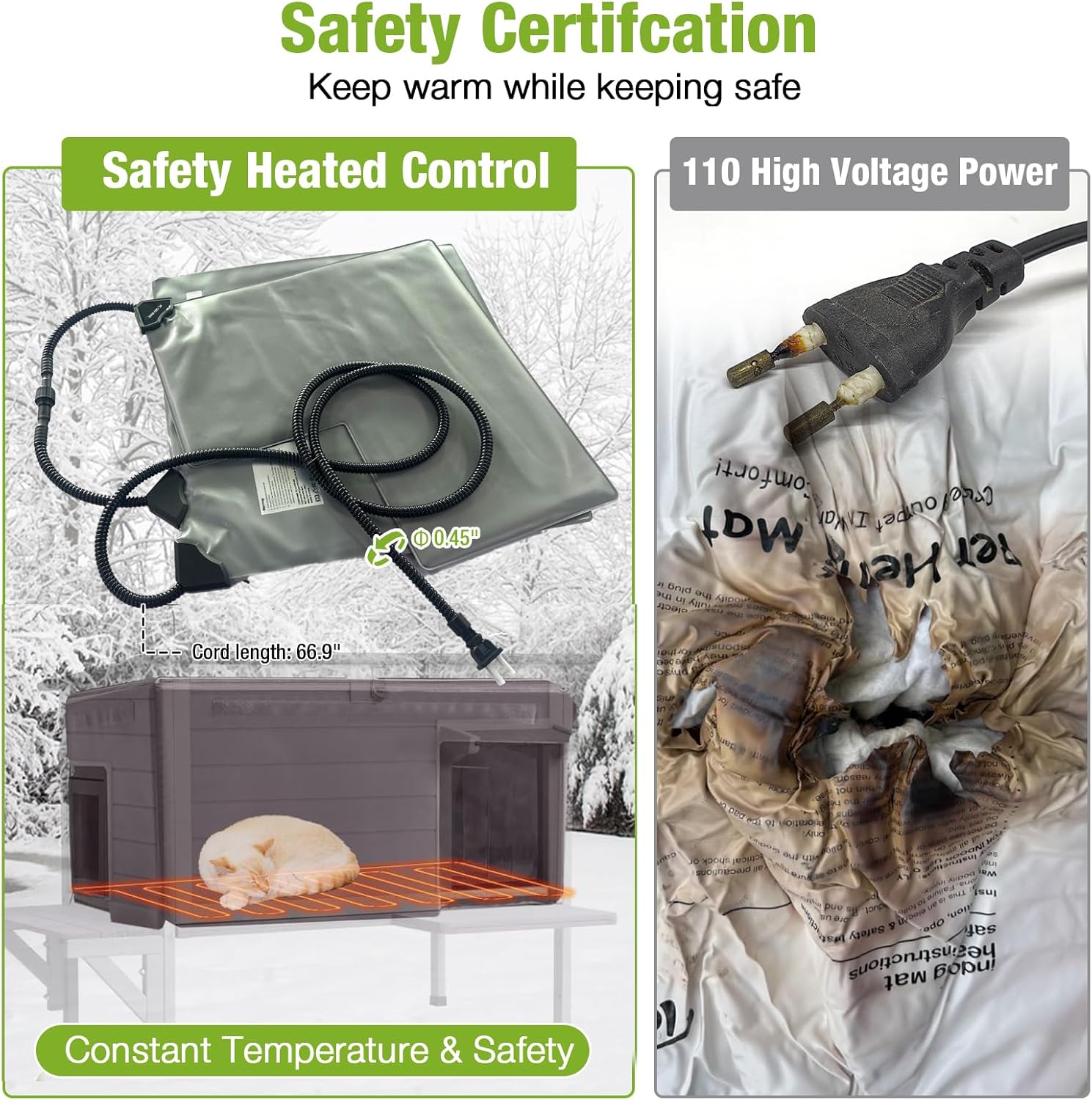 • SAFE HEATING SYSTEM: Equipped with a UL-tested heating pad (automatic temperature control: 89–116°F) and a built-in high-temperature protection device, the heated cat house prevents overheating or chilling. A 6.5 ft chew-resistant cord adds extra safety