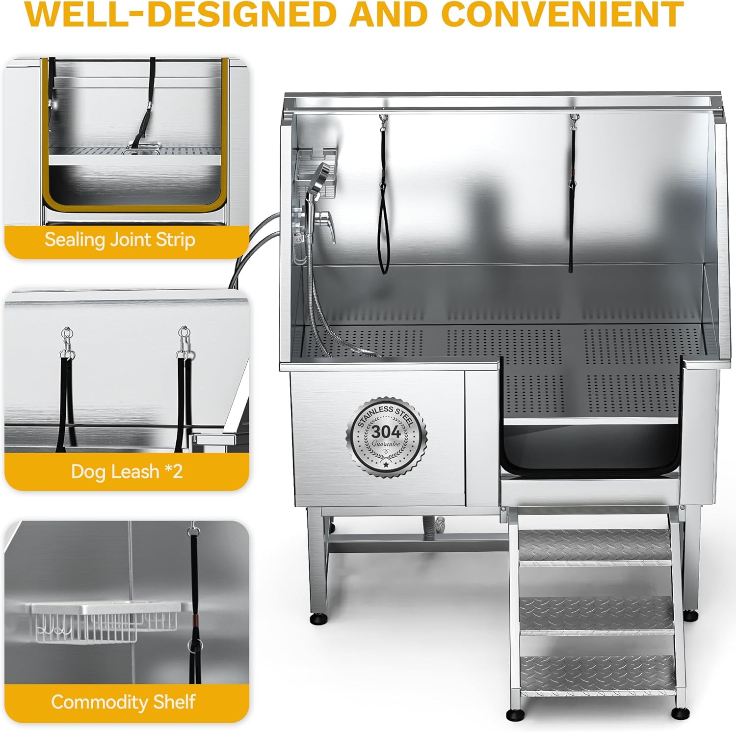 • Durable 304 Stainless Steel Tub Body: With a 330 lb weight capacity, this pet bathtub is built for long-lasting use; The fully welded, one-piece design prevents leaks, while the smooth surface allows for easy cleaning and maintenance