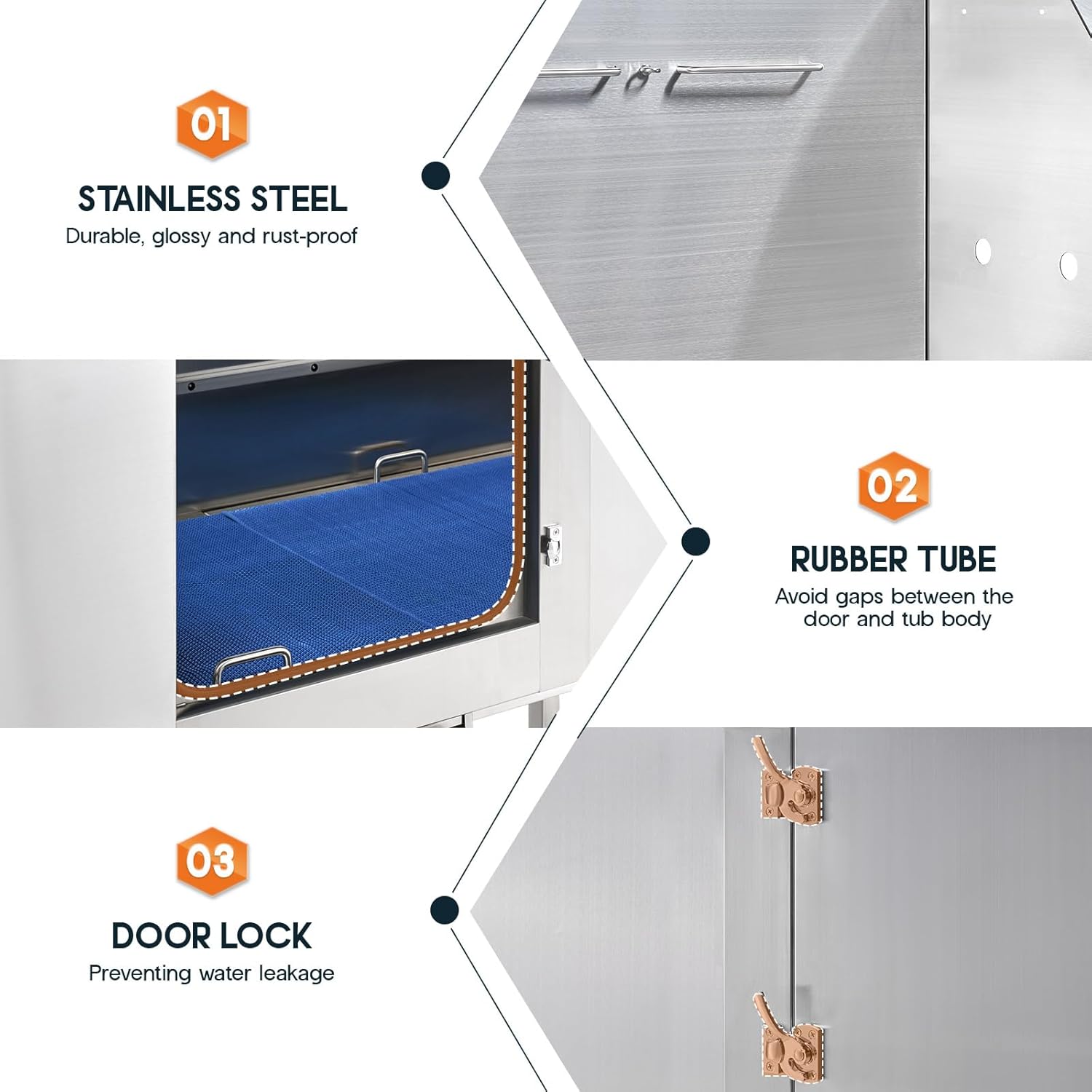• Leak-Proof Design: The 50-inch dog wash station suits pets of various sizes, featuring seamless welding, secure rubber tubing, and locking doors to prevent leaks and escapes.